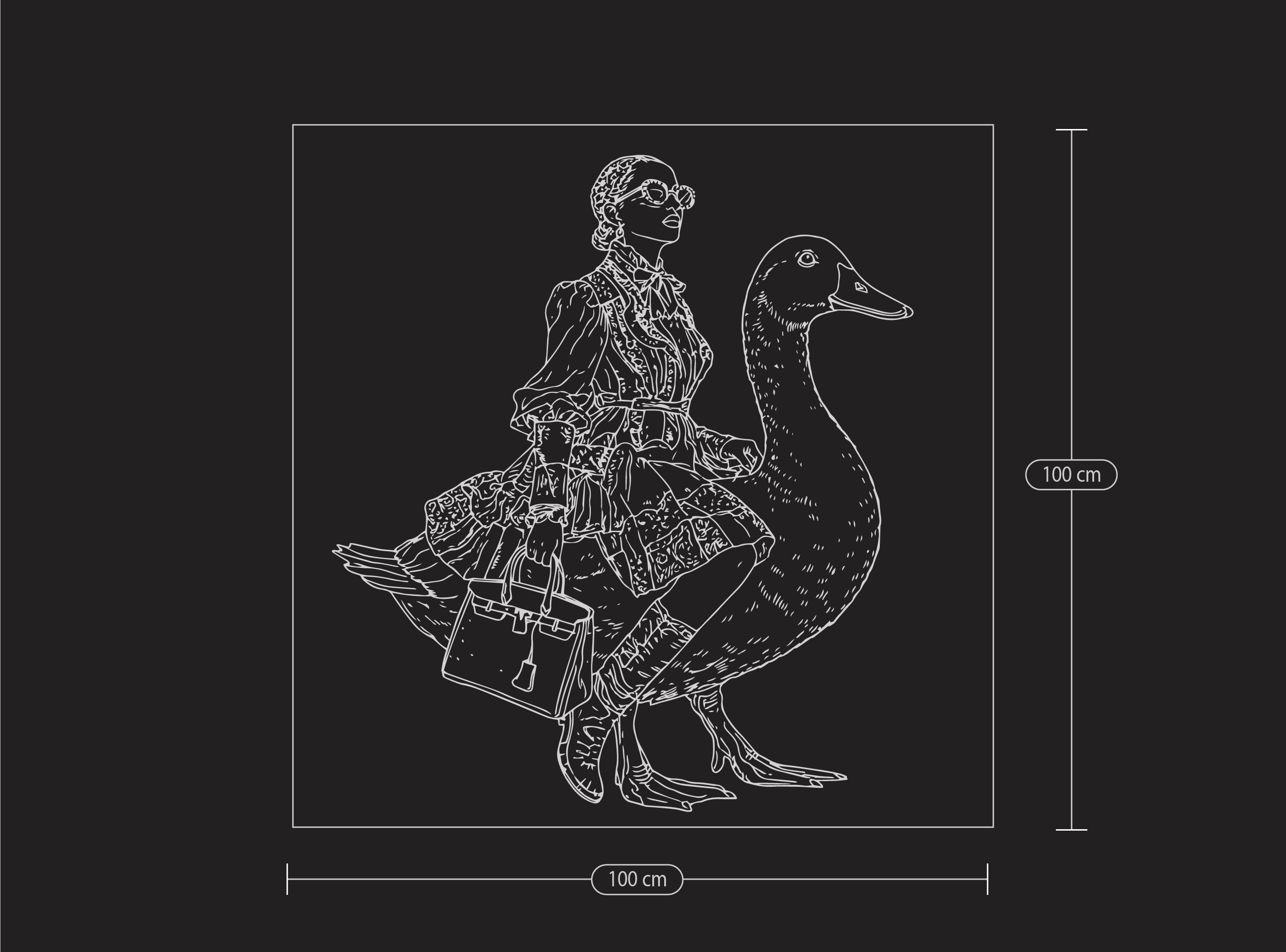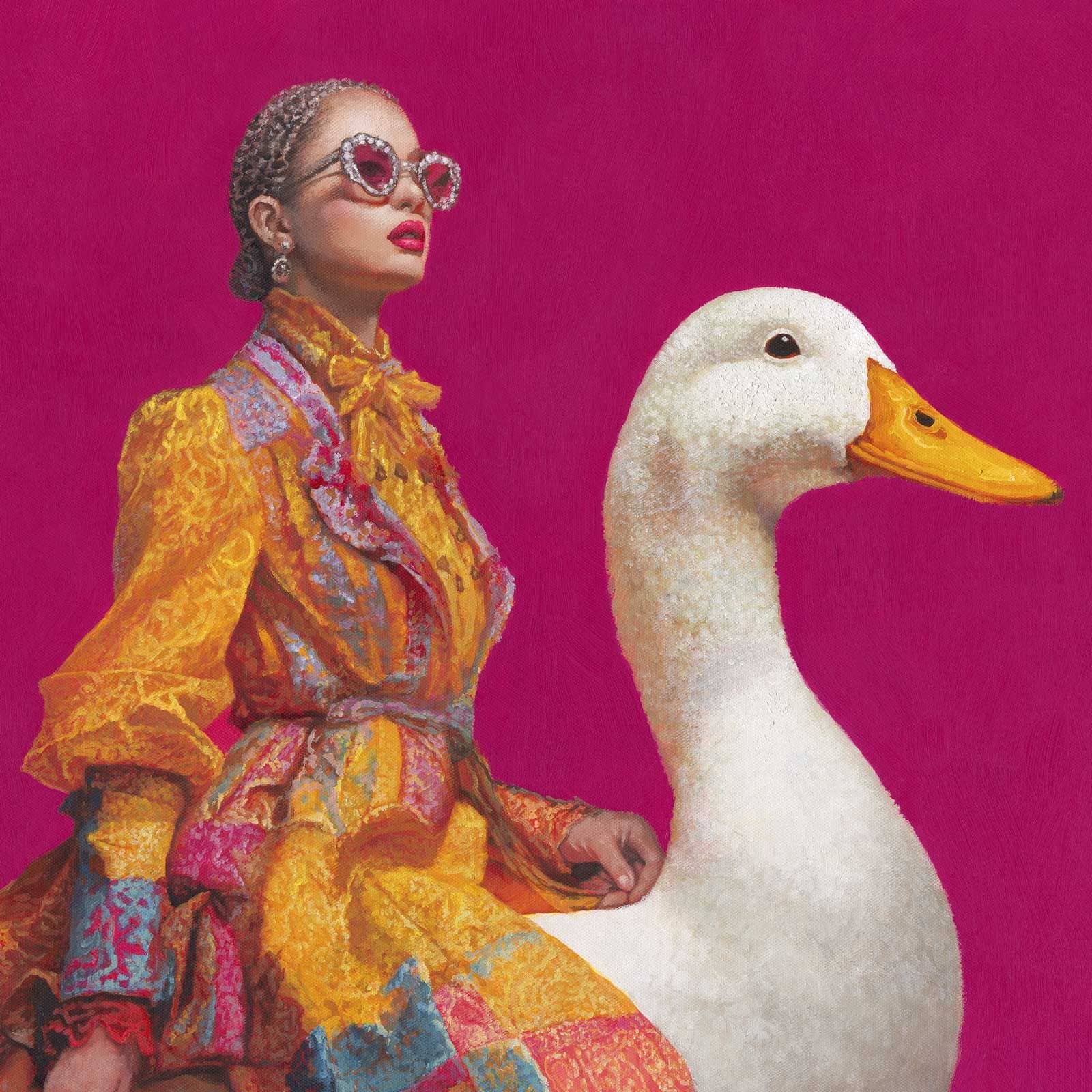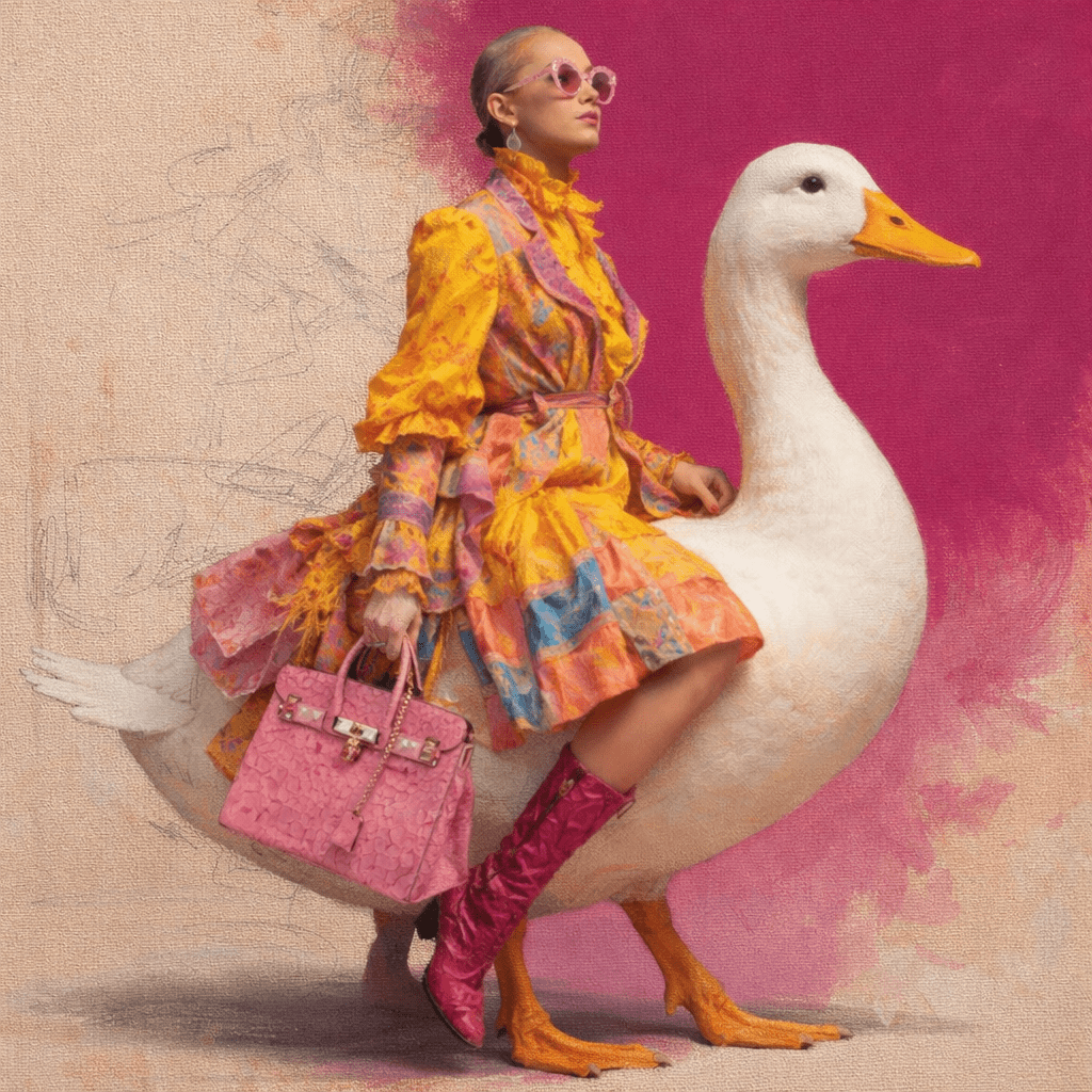 Lady on the Duck entsteht aus dem bewussten Spiel mit Gegensätzen: Couture trifft auf Absurdität, Kontrolle auf Leichtigkeit. In der Ausarbeitung wird die Szene Schicht für Schicht präzisiert, bis Humor nicht laut wirkt, sondern selbstverständlich. Die Ente trägt, ohne zu hinterfragen. Die Figur bleibt souverän, ohne sich zu erklären. Das Bild erzählt davon, dass wahre Freiheit dort beginnt, wo Stil und Selbstironie sich auf Augenhöhe begegnen.