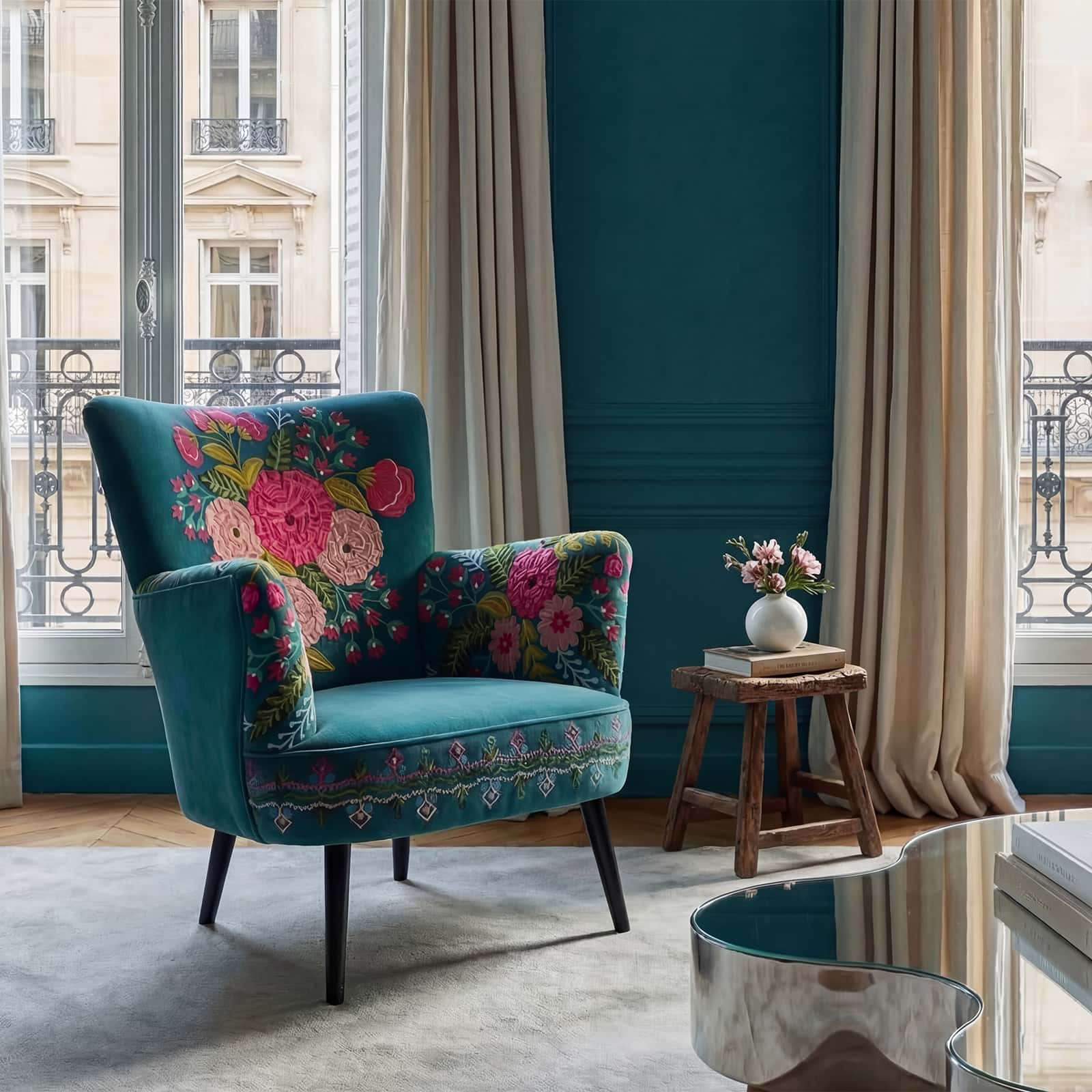 Lænestol i fløjl med blomstermotivet Frida, turkis, håndbroderet