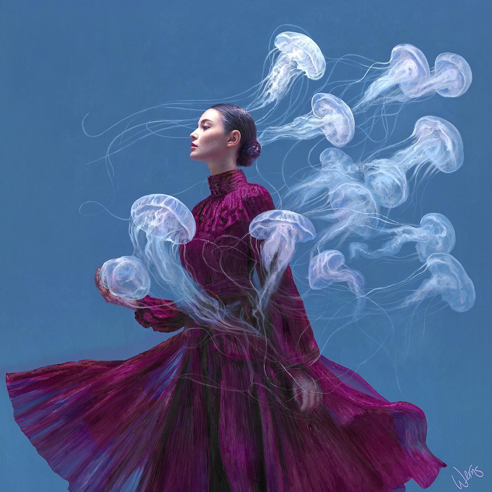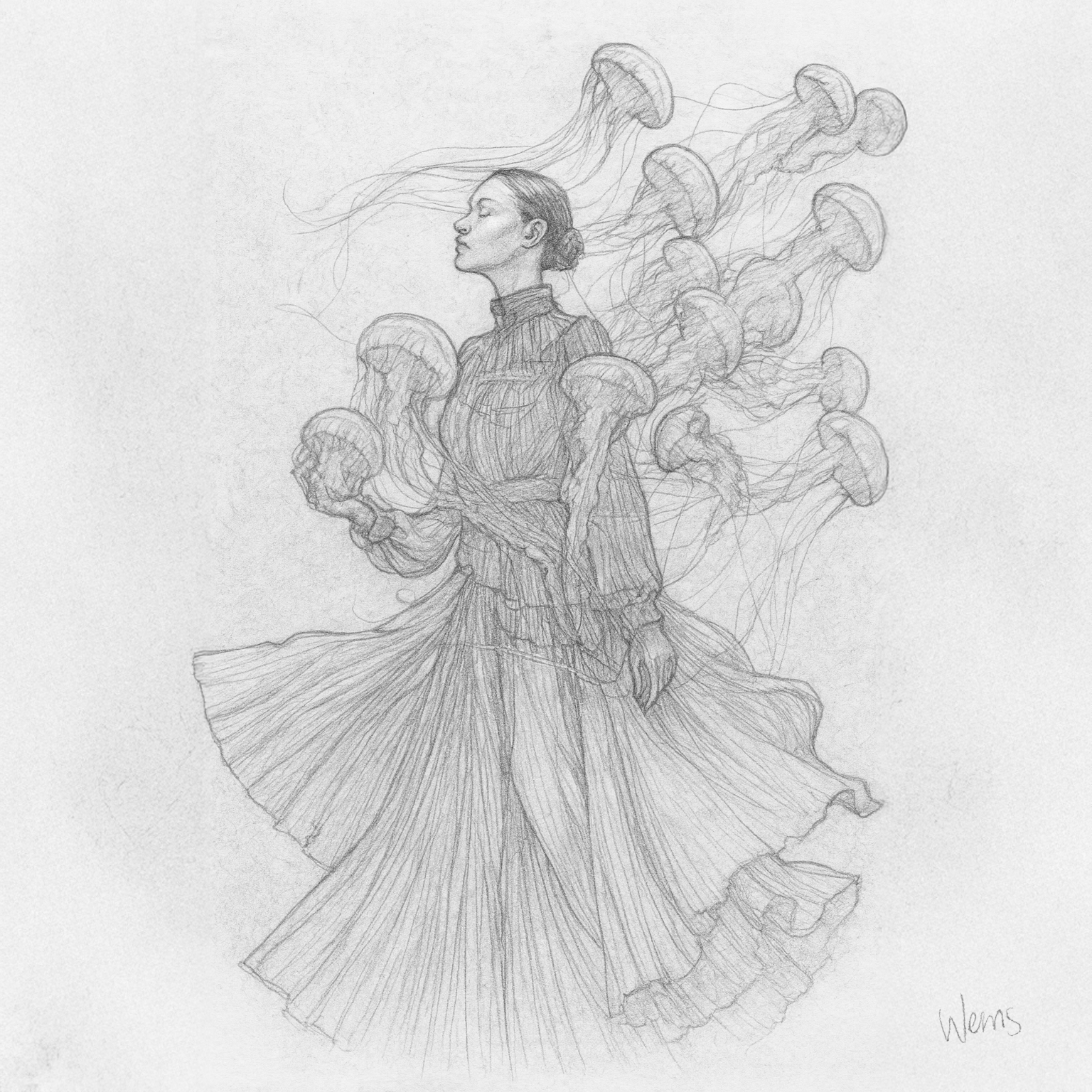 Dancing with Ava udspringer af idéen om ikke at fastholde følelser, men lade dem flyde. I bearbejdningen anlægges både figuren og vandmændene bevidst let og transparente. De svævende former virker som tanke-tråde, der frit må bevæge sig. Én enkelt vandmand bliver et roligt kontaktpunkt. Lag for lag fortætter billedet sig til et stille udsagn: De blødeste sider rummer ofte den største klarhed.
