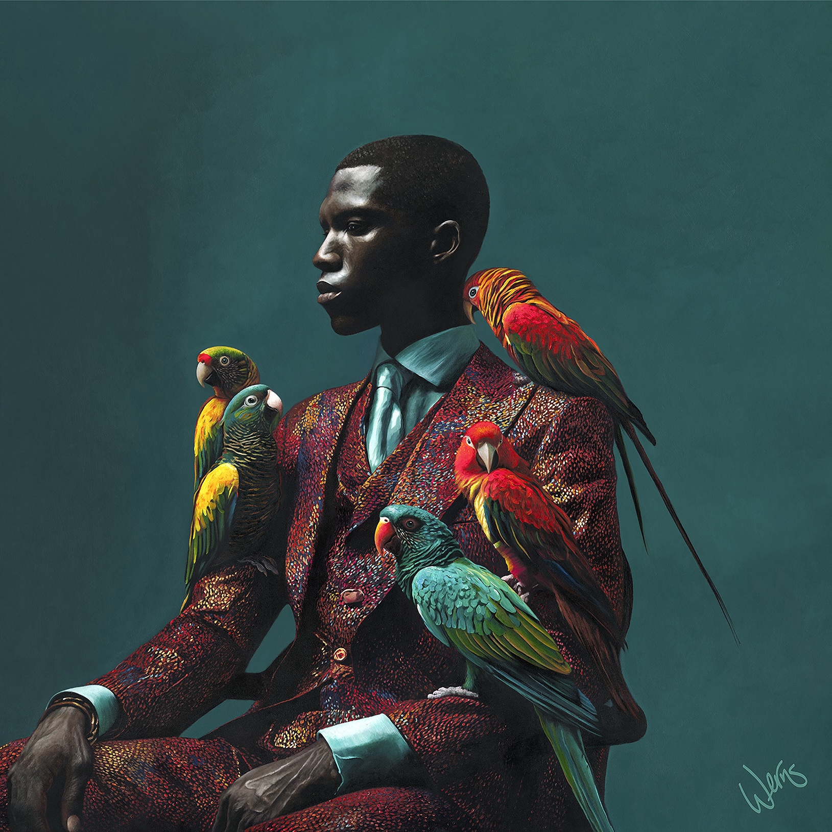 The Parrots of Percy udspringer af idéen om ikke at styre udtryk, men at give det plads. I bearbejdningen holdes figuren bevidst rolig, mens papegøjerne indtager forskellige retninger. Farven bliver her ikke tæmmet, men båret. Lag for lag fortætter billedet sig til en holdning: Den, der stoler på sig selv, behøver ikke at forklare sine farver – de taler for sig selv.