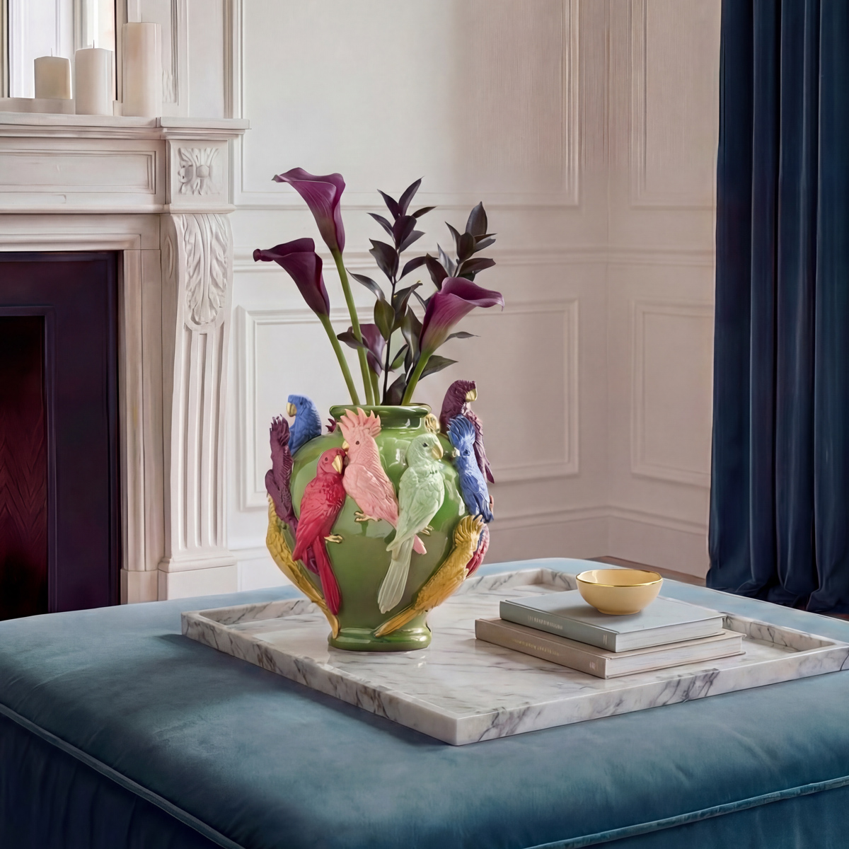 Denne vase i kraftig grøn bringer tropisk stemning ind i dit hjem. De charmerende papegøjefigurer på kanten giver et strejf af eksotisk flair og gør vasen til et ægte blikfang.
