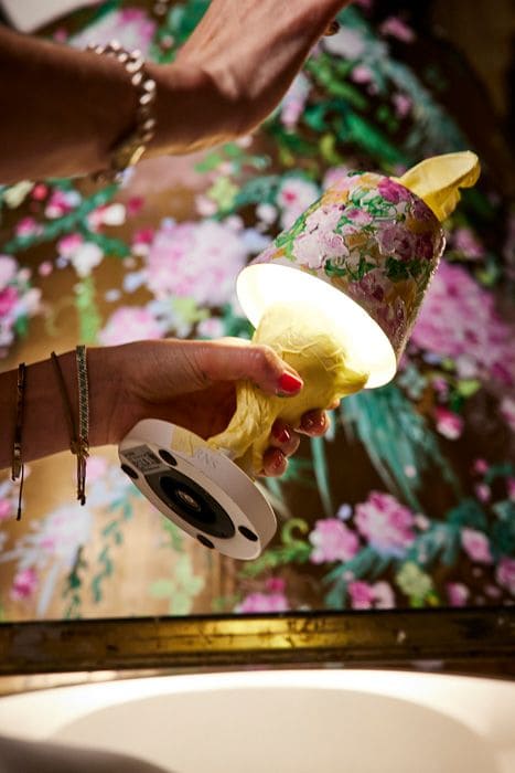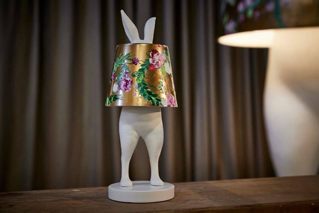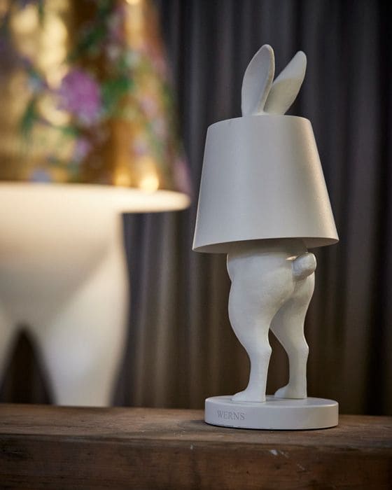 The iconic Hiding Rabbit Lamp by WERNS provides the sculptural foundation – clear, reduced, instantly recognizable. Juliane Golbs transforms this form into a canvas for storytelling, adding layers of paint, symbols, and textures.