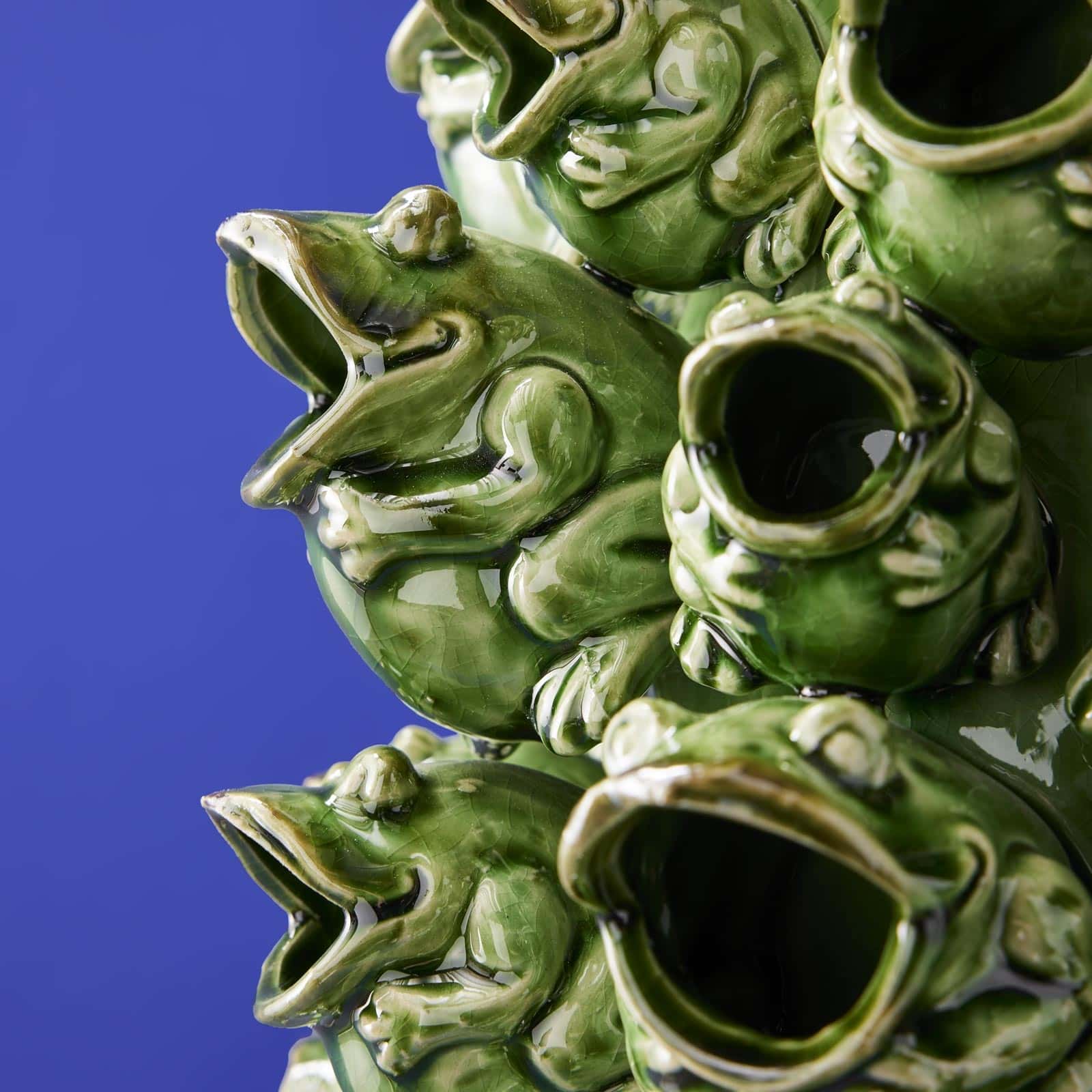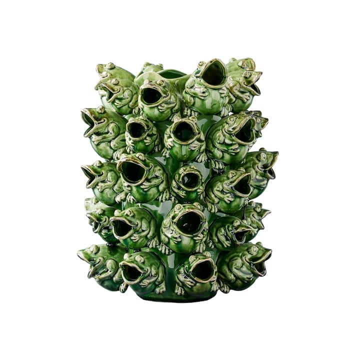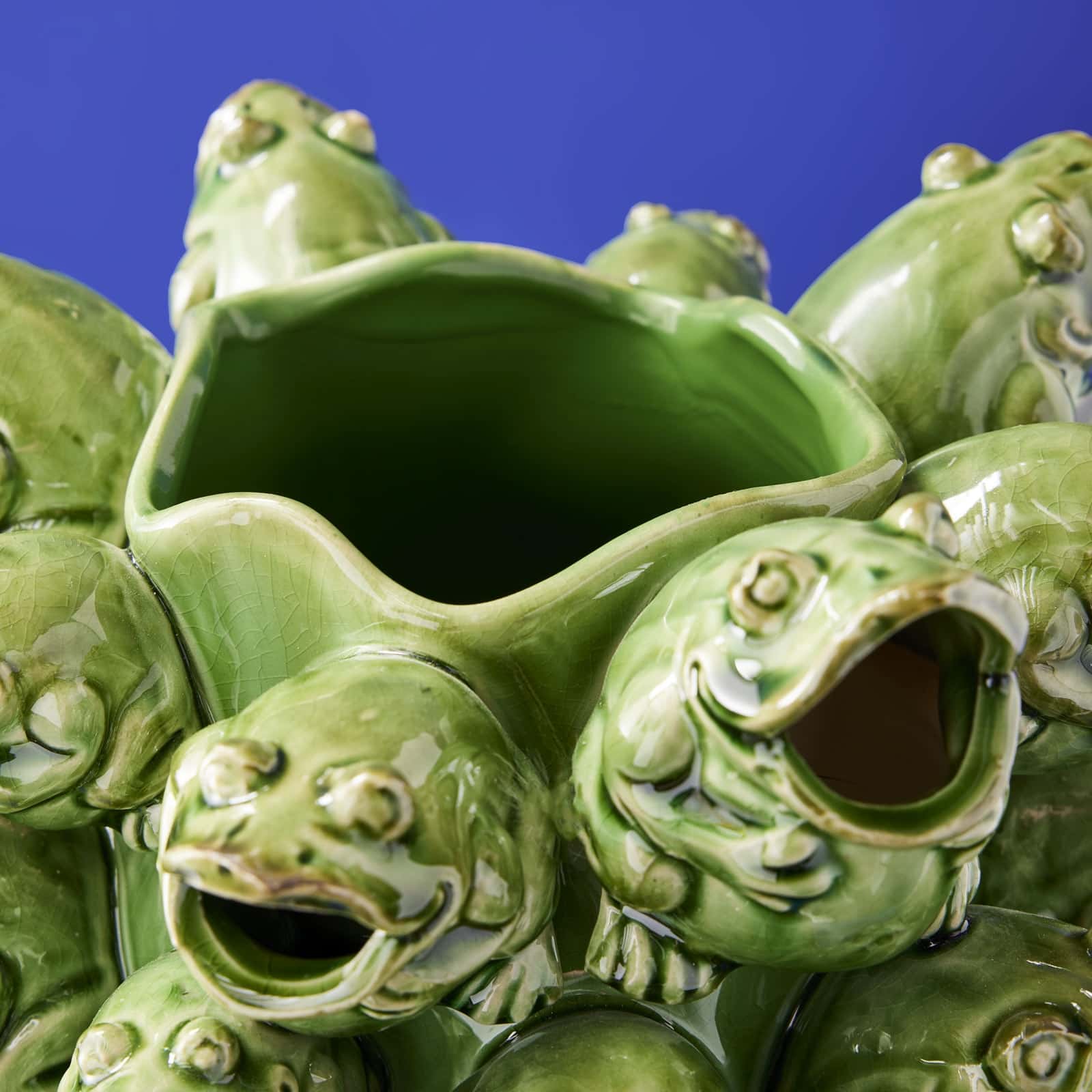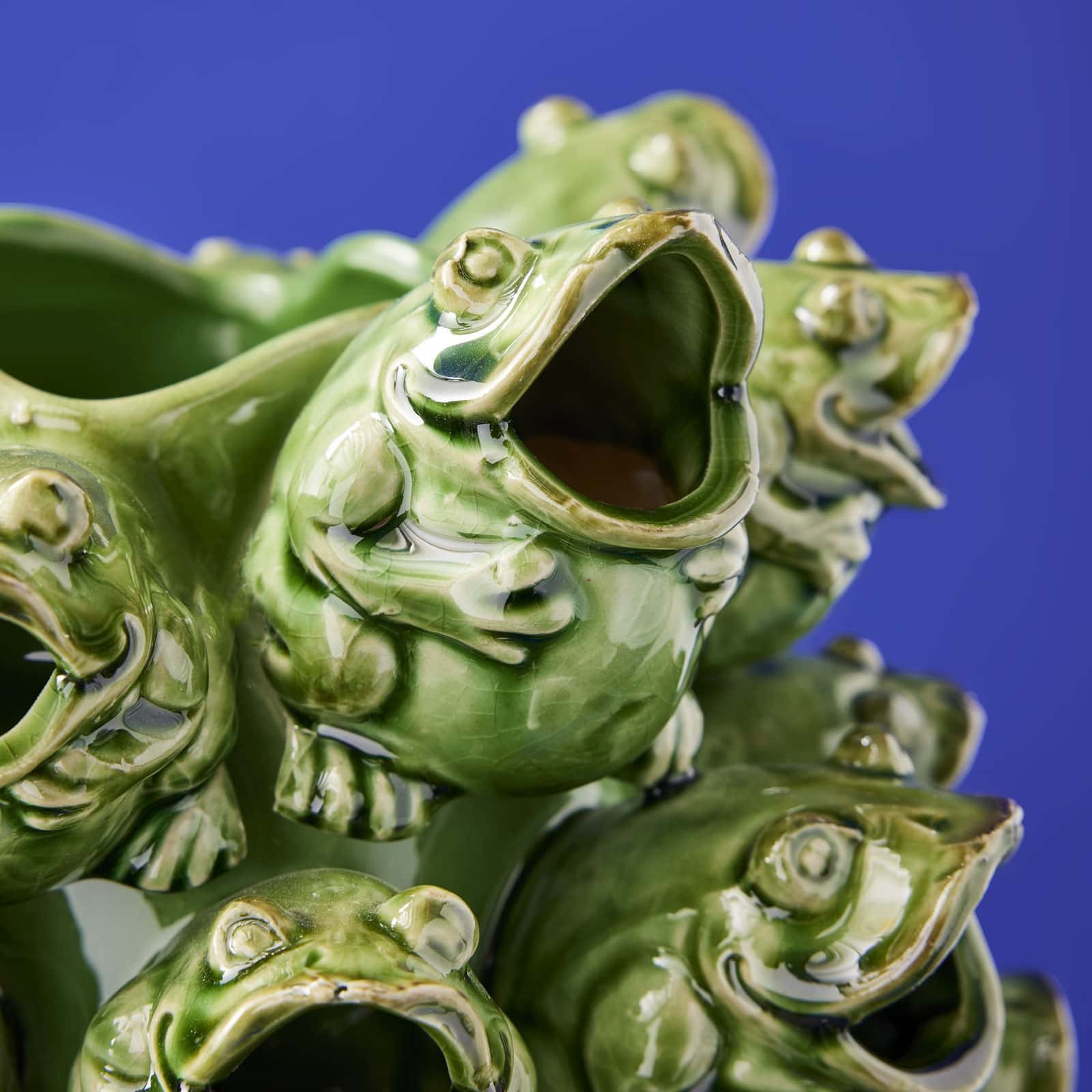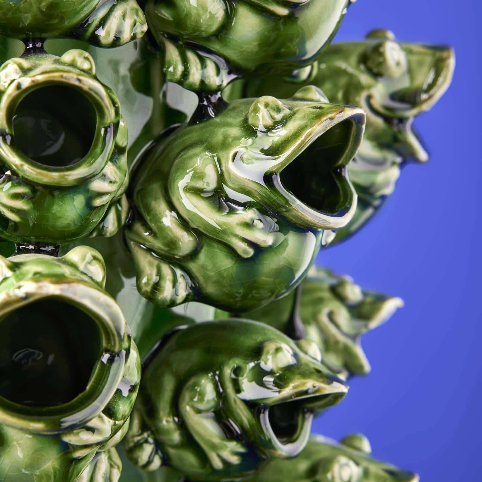 A vase with handcrafted, hand-glazed frog motifs and a characterful presence.
