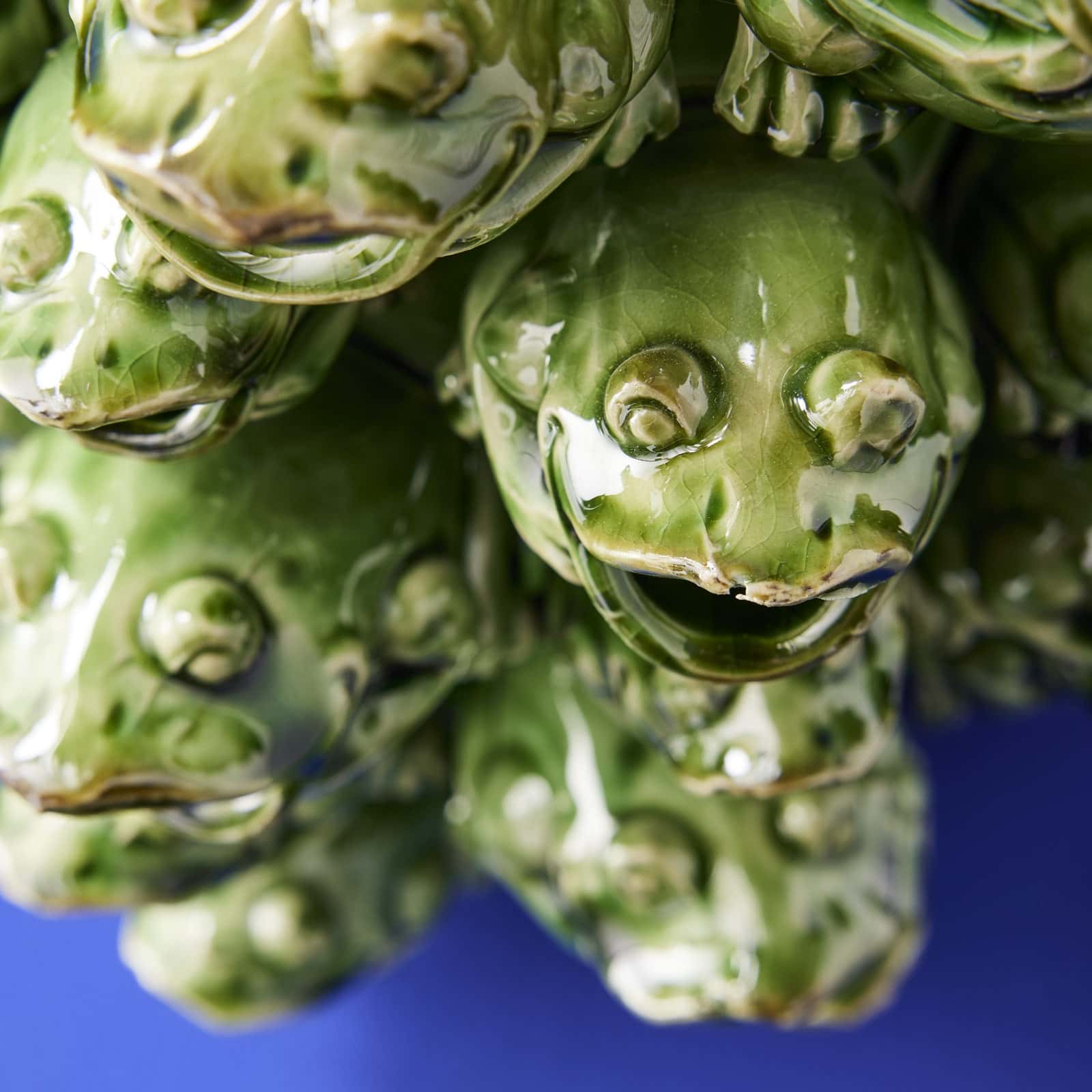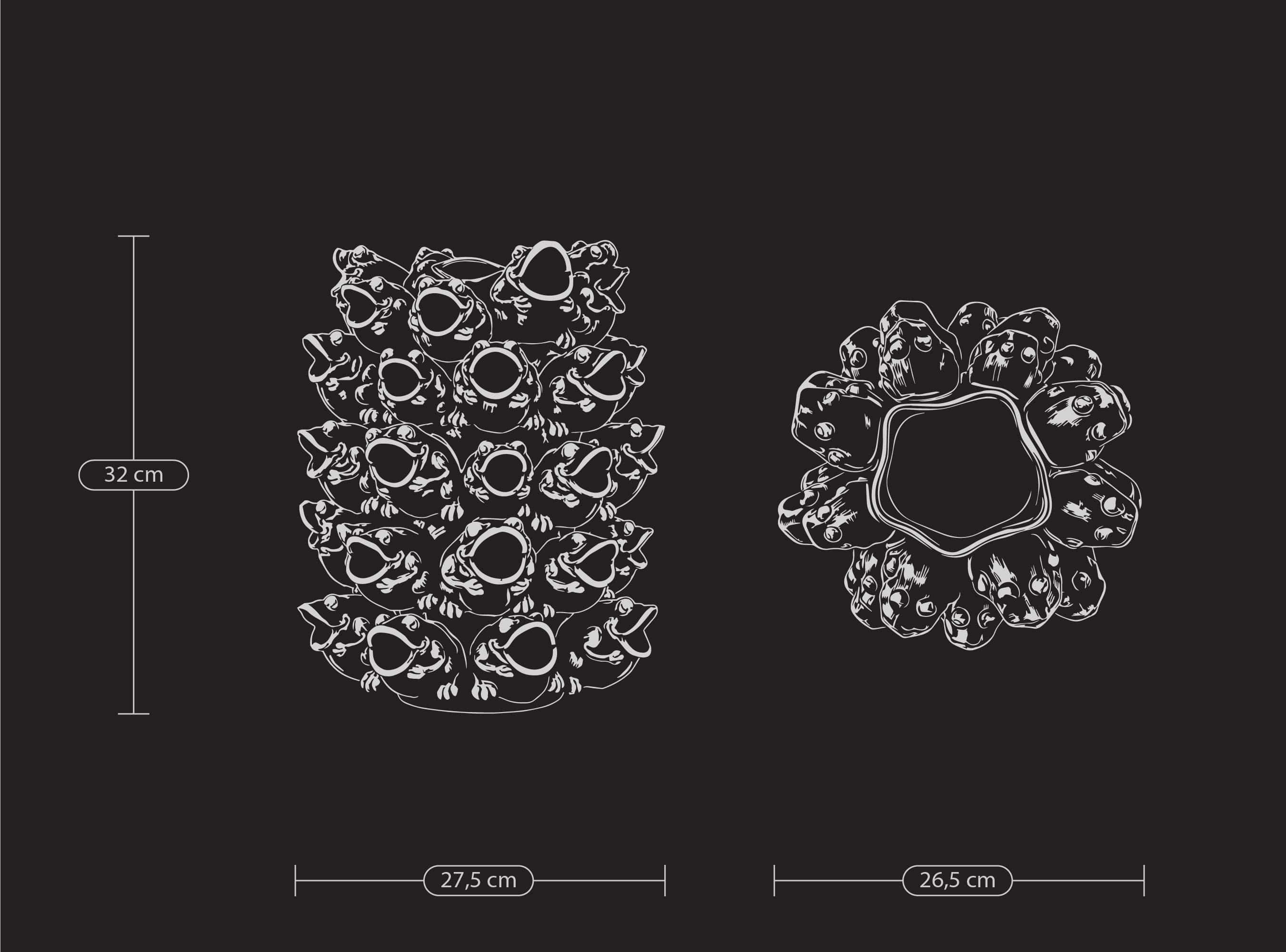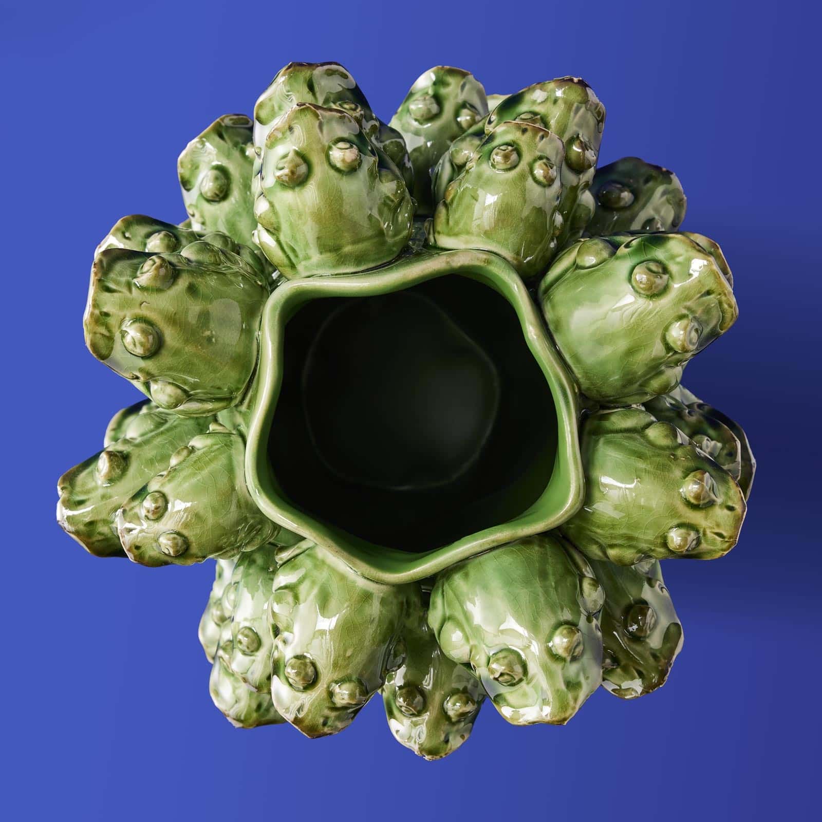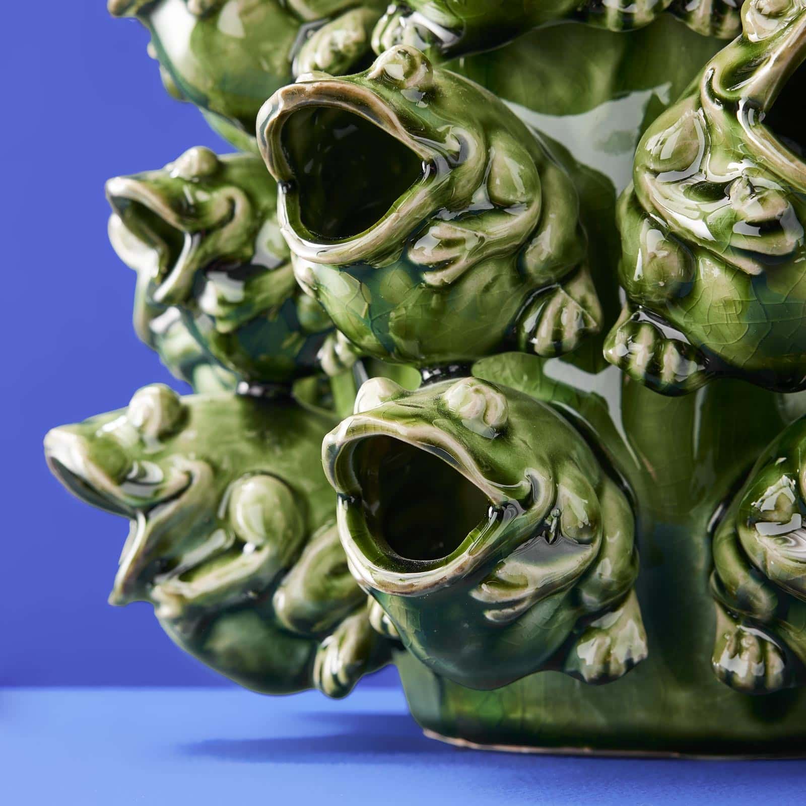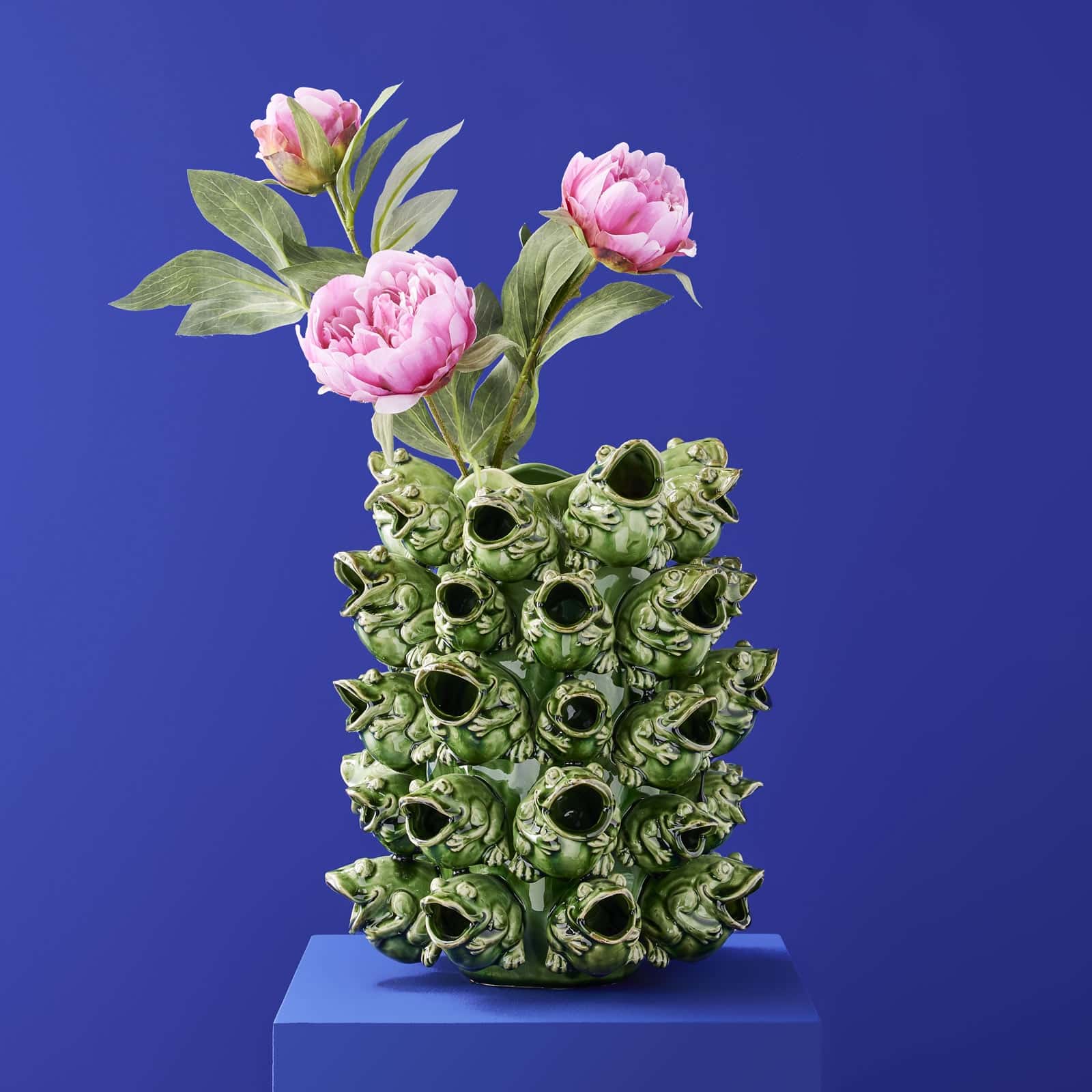 A vase with handcrafted, hand-glazed frog motifs and a characterful presence.