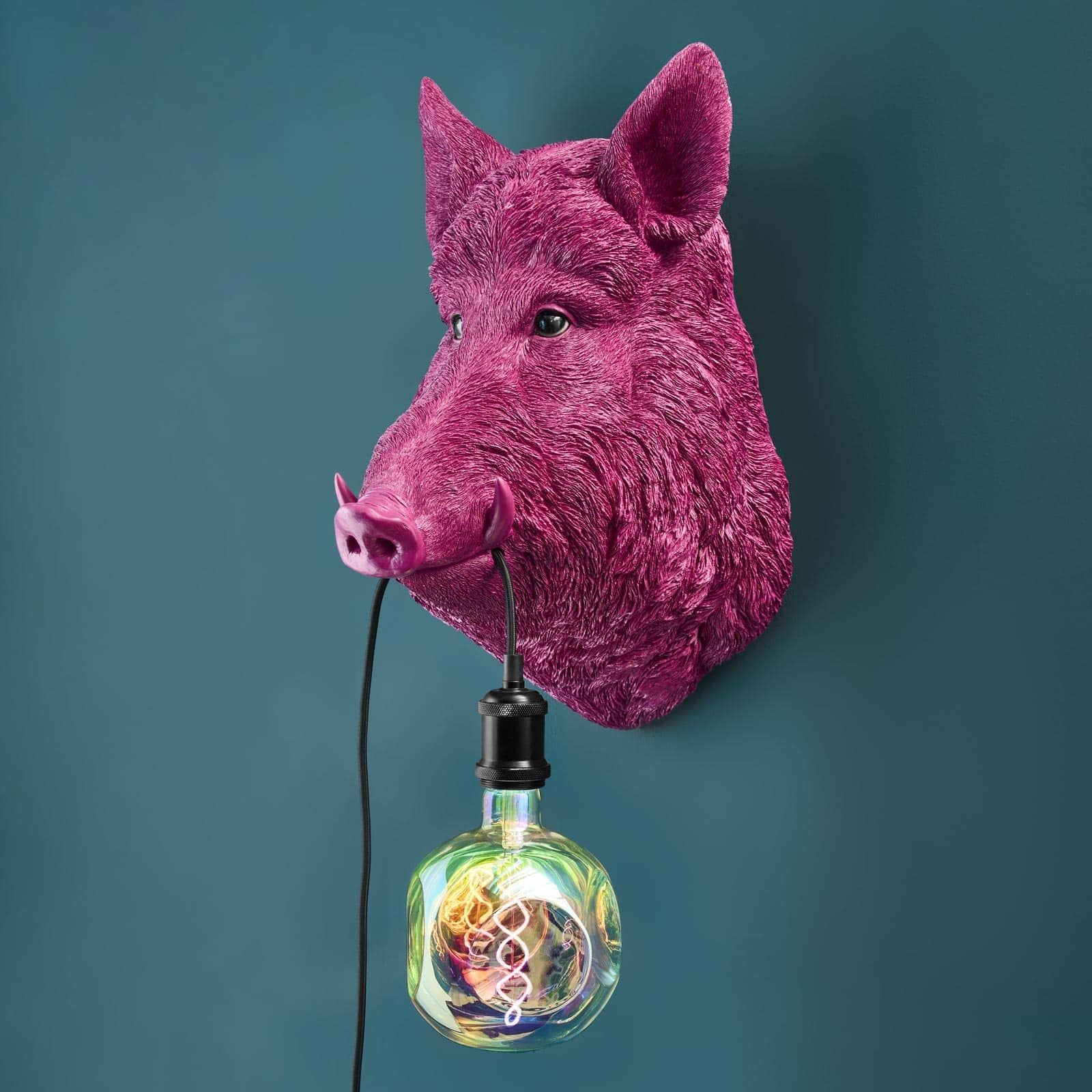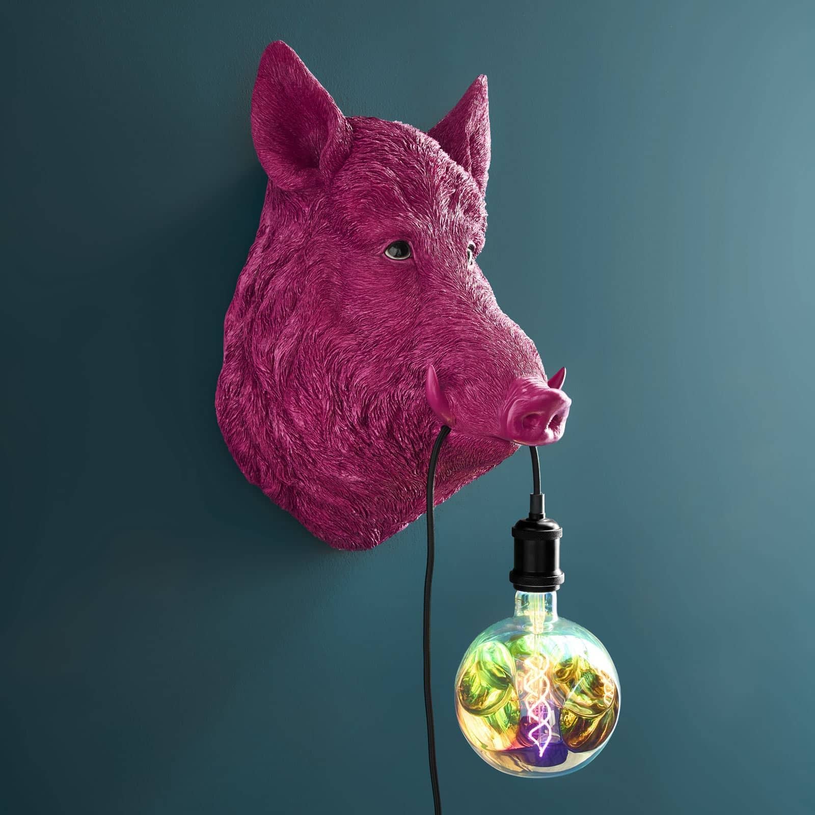 This striking wall lamp by WERNS® in the shape of a wild boar is made of sturdy polyresin and comes in a vibrant magenta color. It brings color and character to any interior and provides unique lighting.