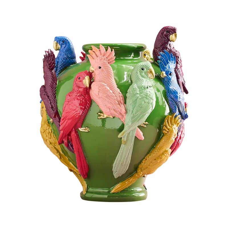 Questo vaso in un verde intenso porta un tocco tropicale nella tua casa. Le affascinanti figure di pappagalli sul bordo aggiungono un tocco esotico e rendono il pezzo un vero punto focale.