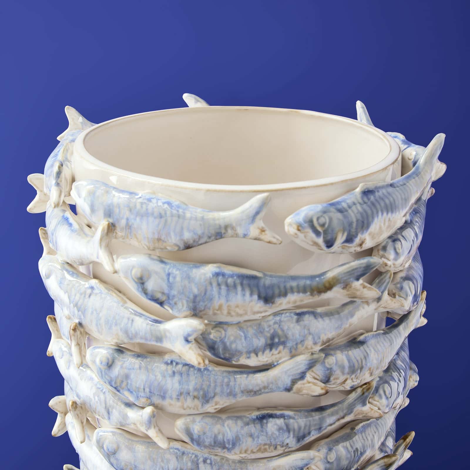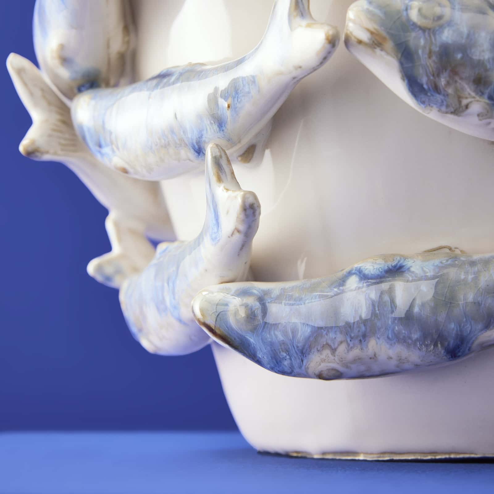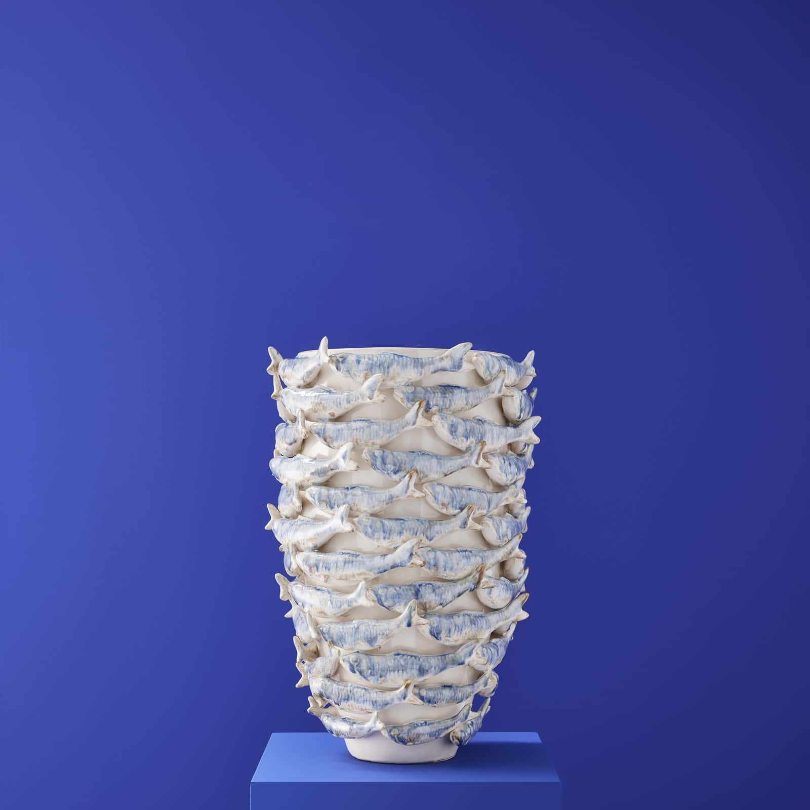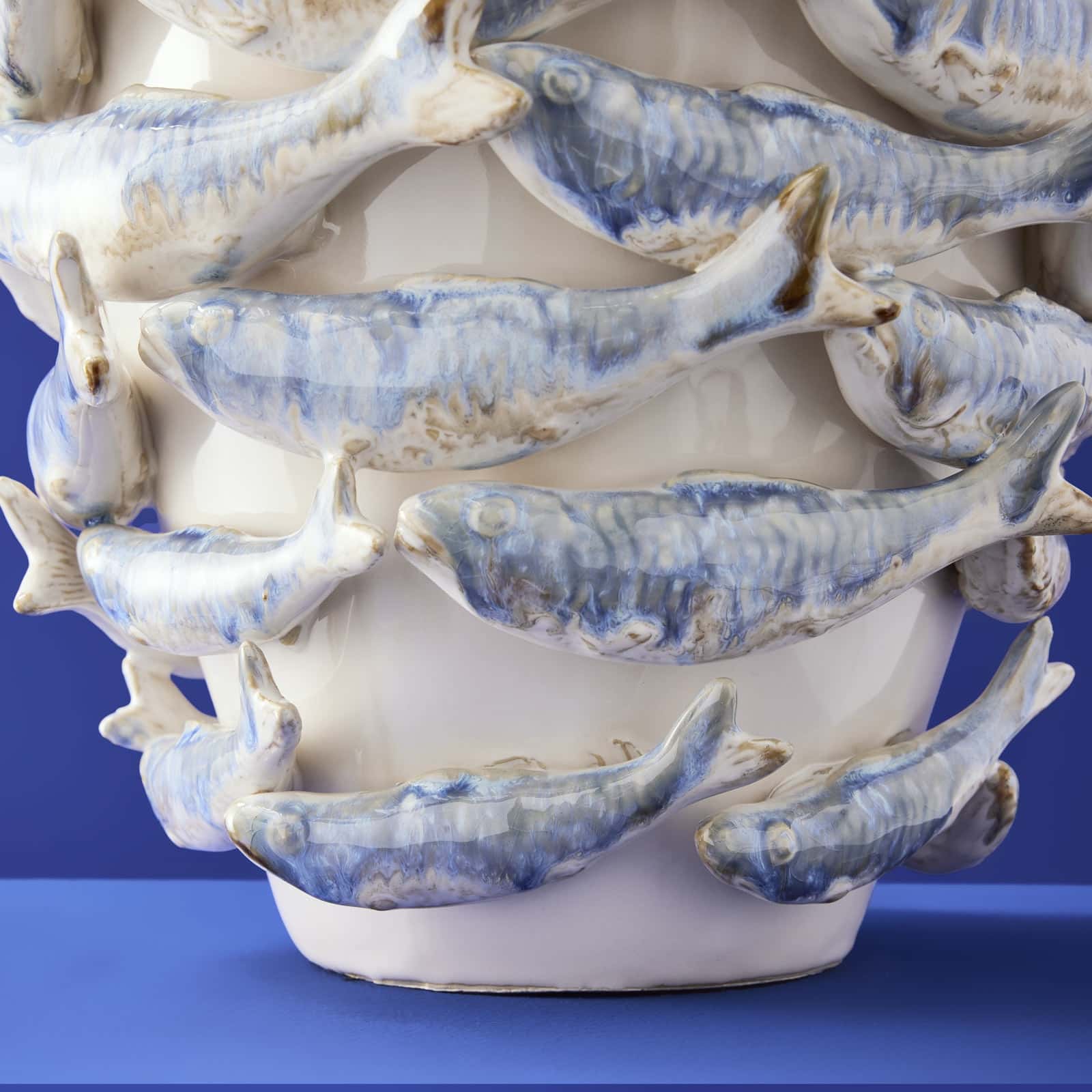 Sculpturale vaas met plastisch uitgewerkte vismotieven en een markante aanwezigheid in de ruimte.