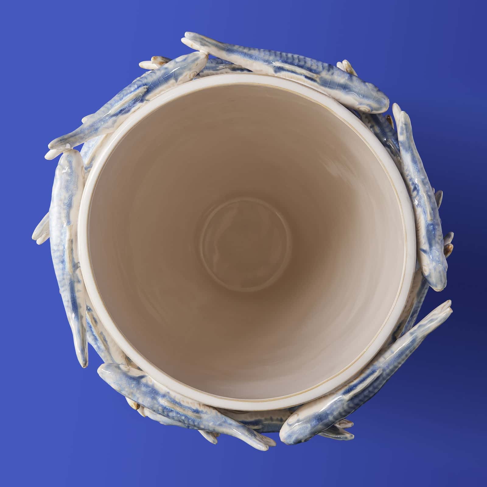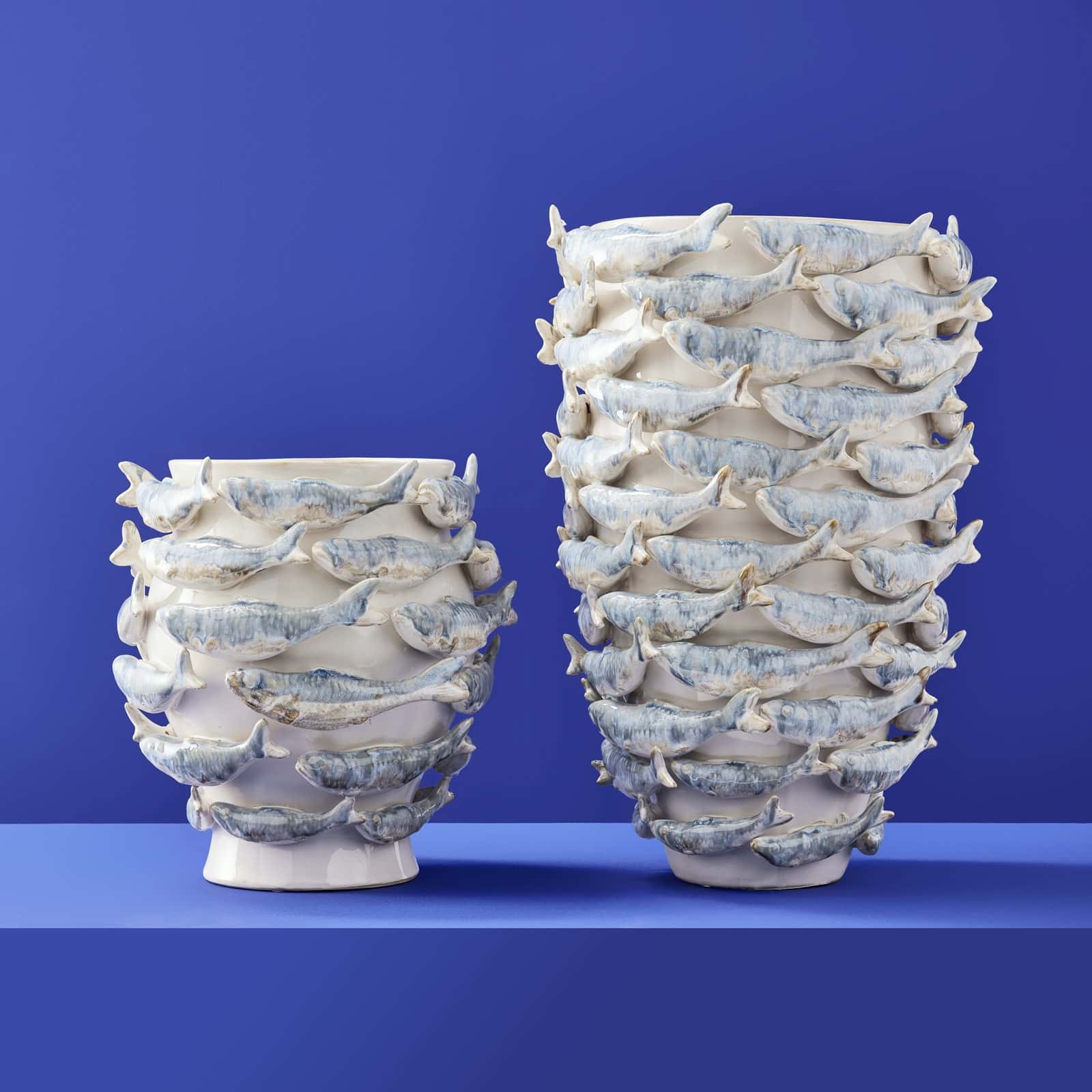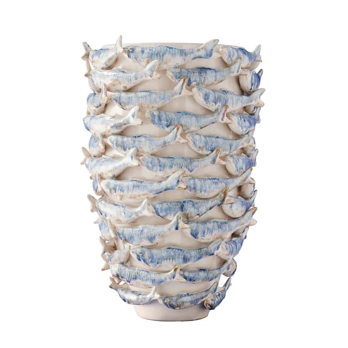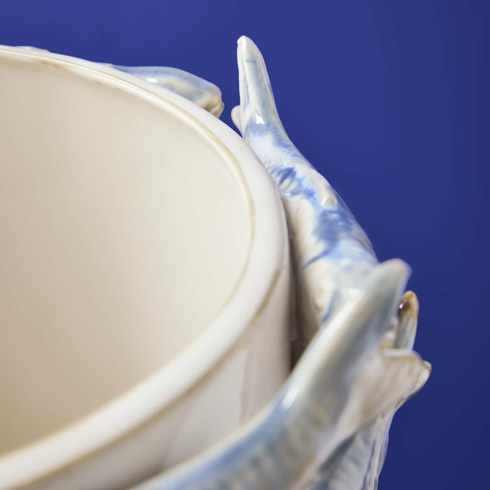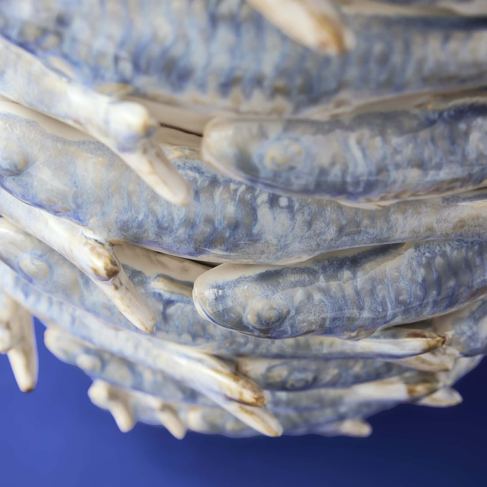 Sculpturale vaas met plastisch uitgewerkte vismotieven en een markante aanwezigheid in de ruimte.