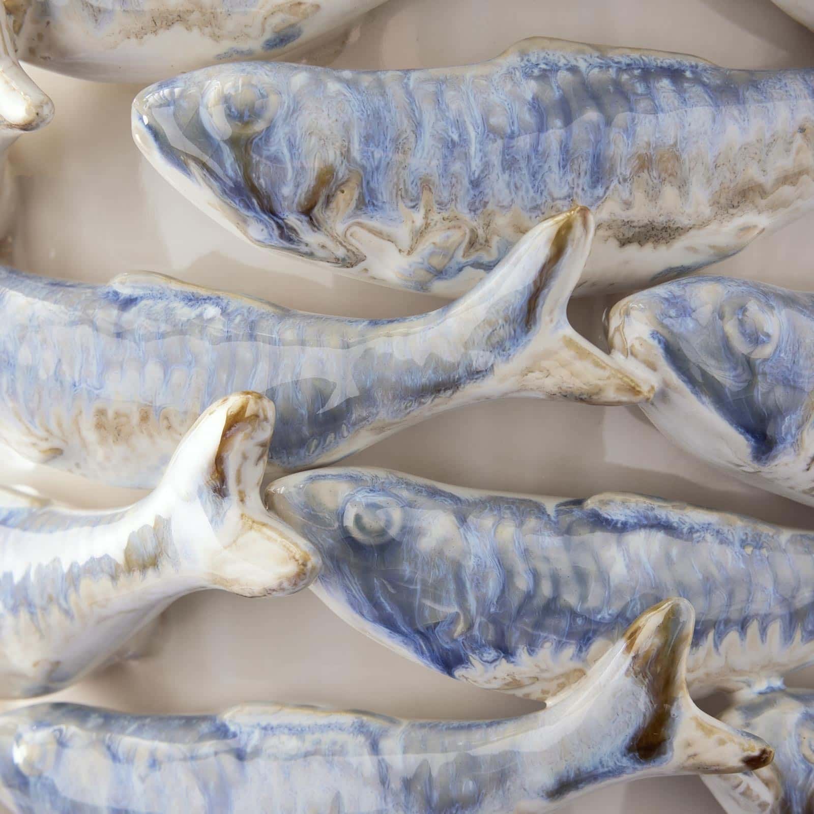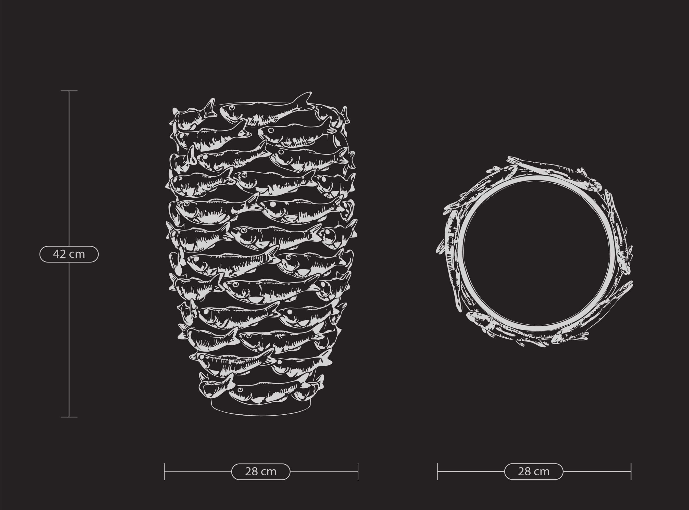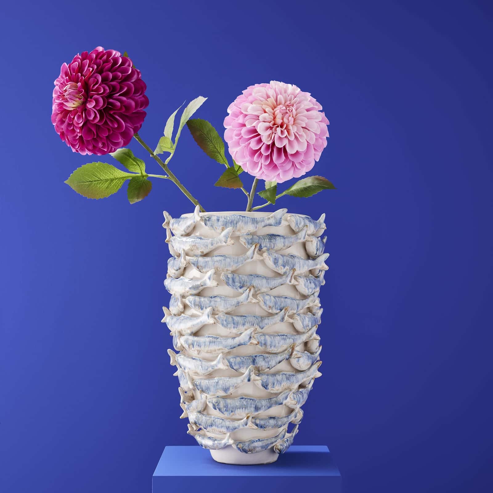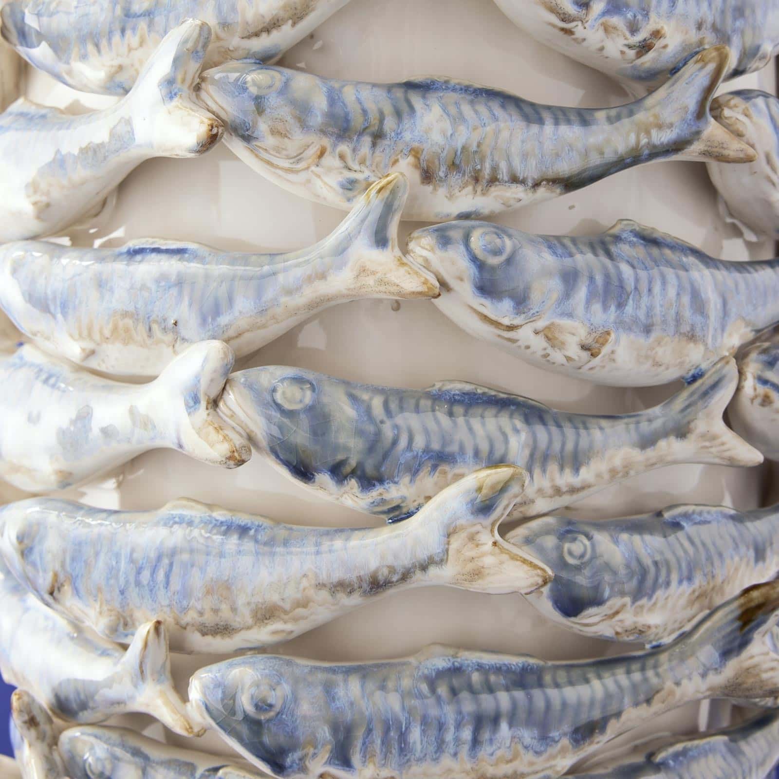 Sculpturale vaas met plastisch uitgewerkte vismotieven en een markante aanwezigheid in de ruimte.
