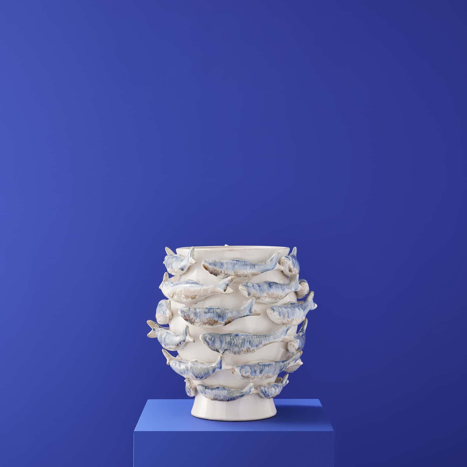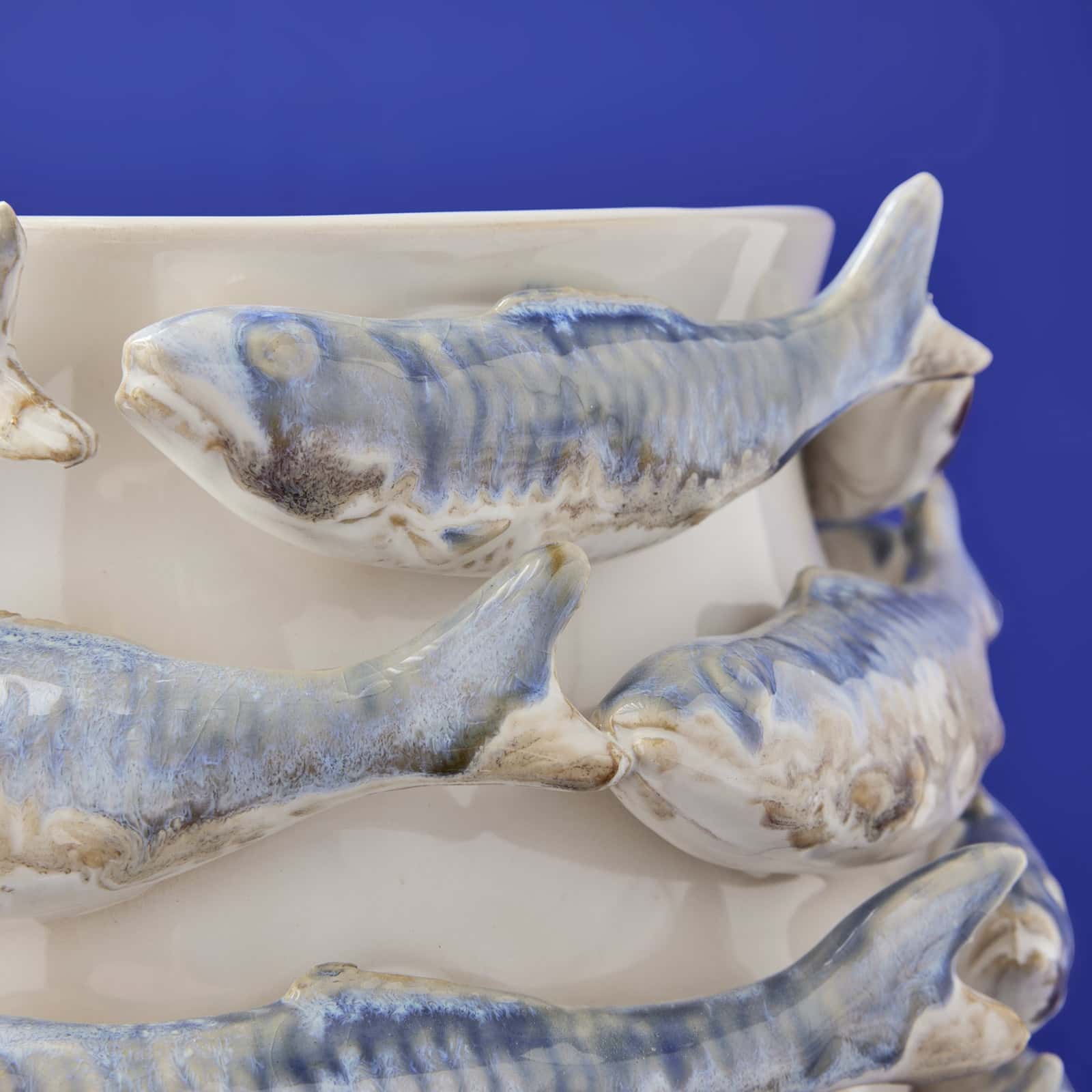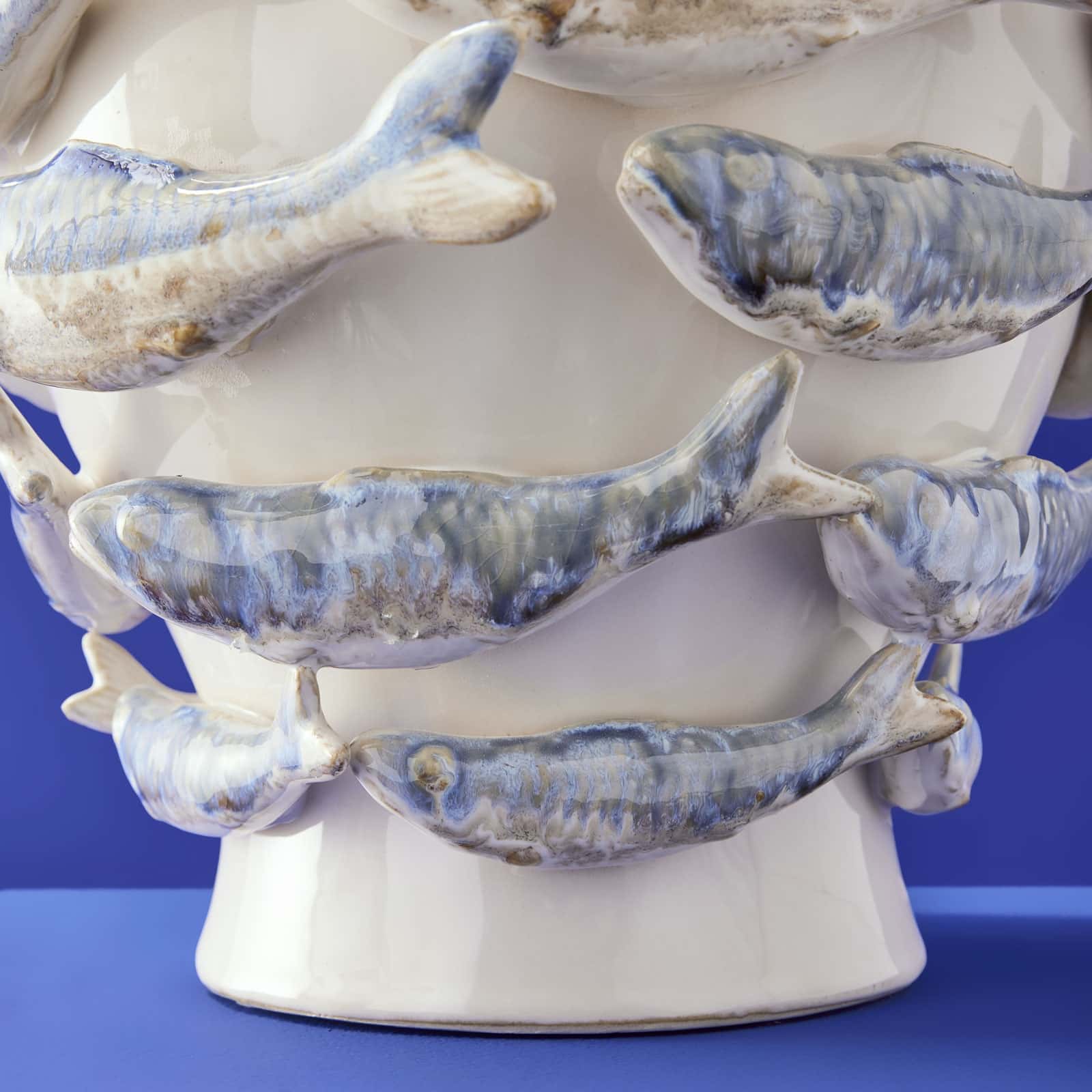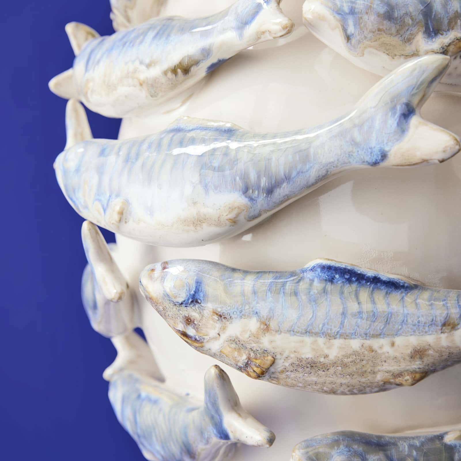 Sculpturale vaas met plastisch uitgewerkte vismotieven en een markante aanwezigheid in de ruimte.