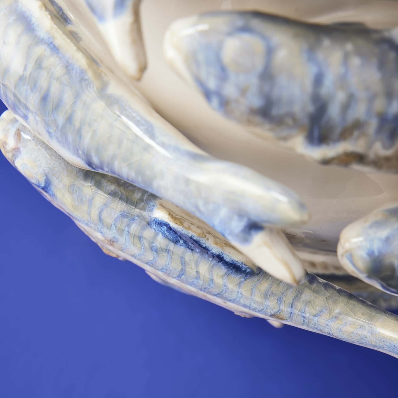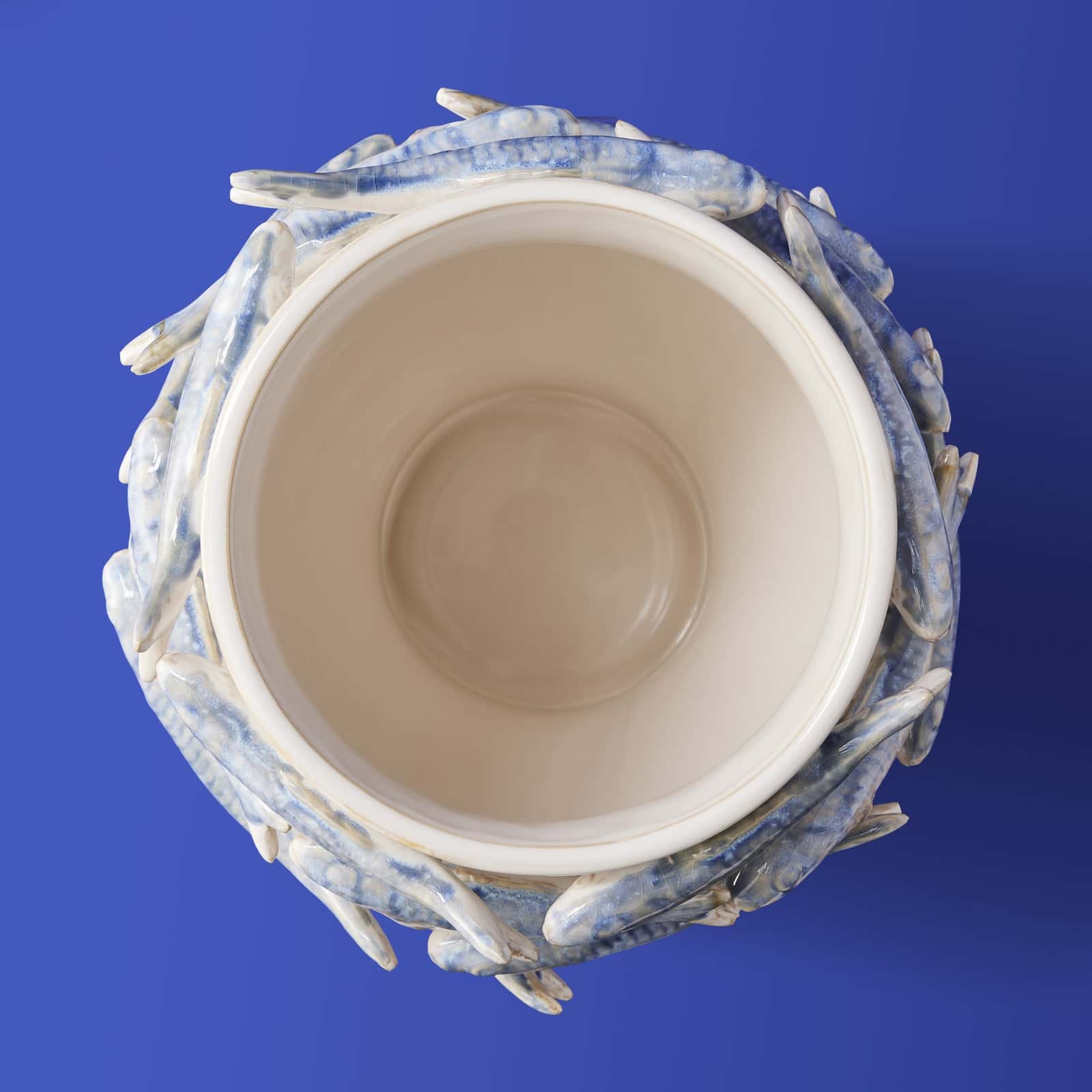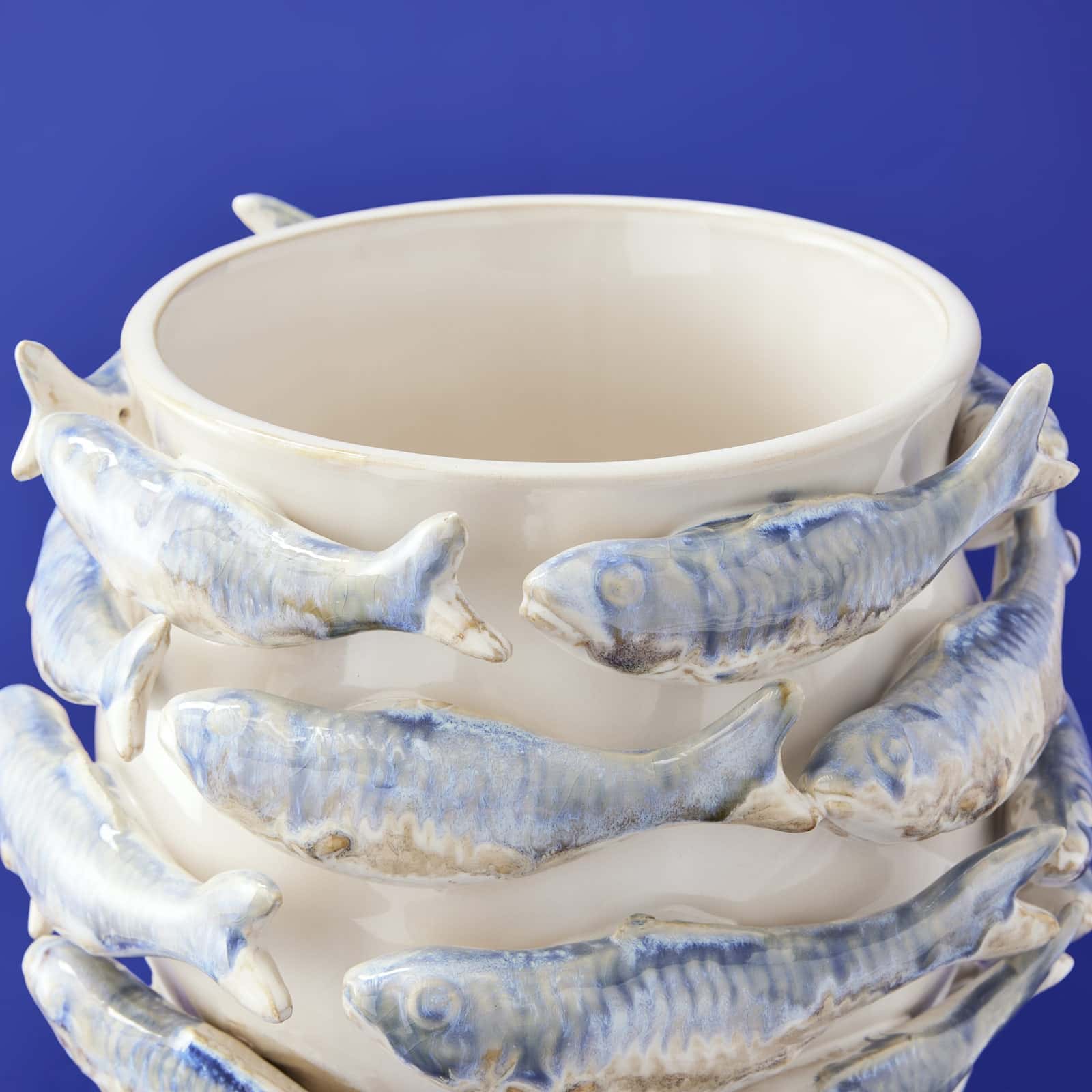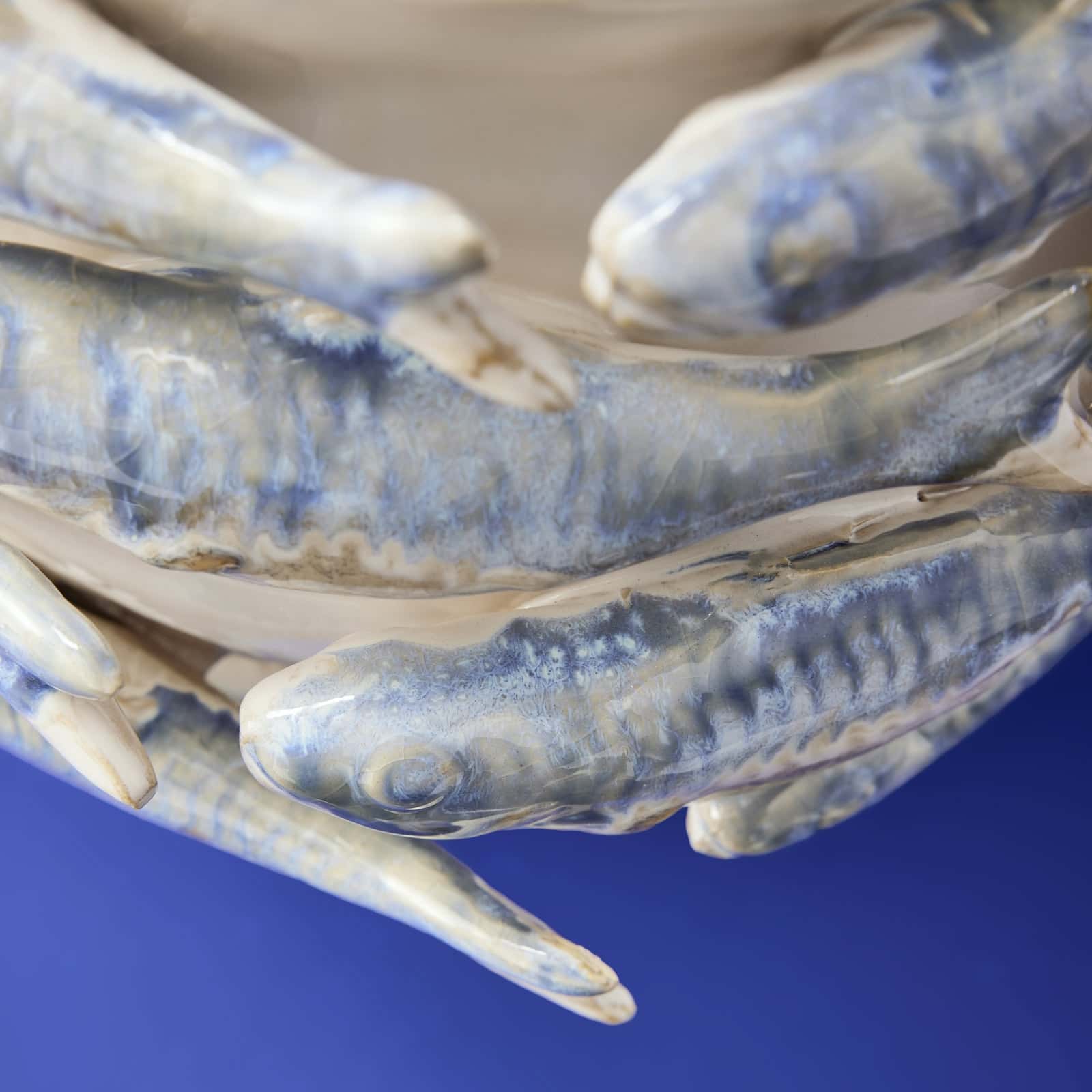 Sculpturale vaas met plastisch uitgewerkte vismotieven en een markante aanwezigheid in de ruimte.