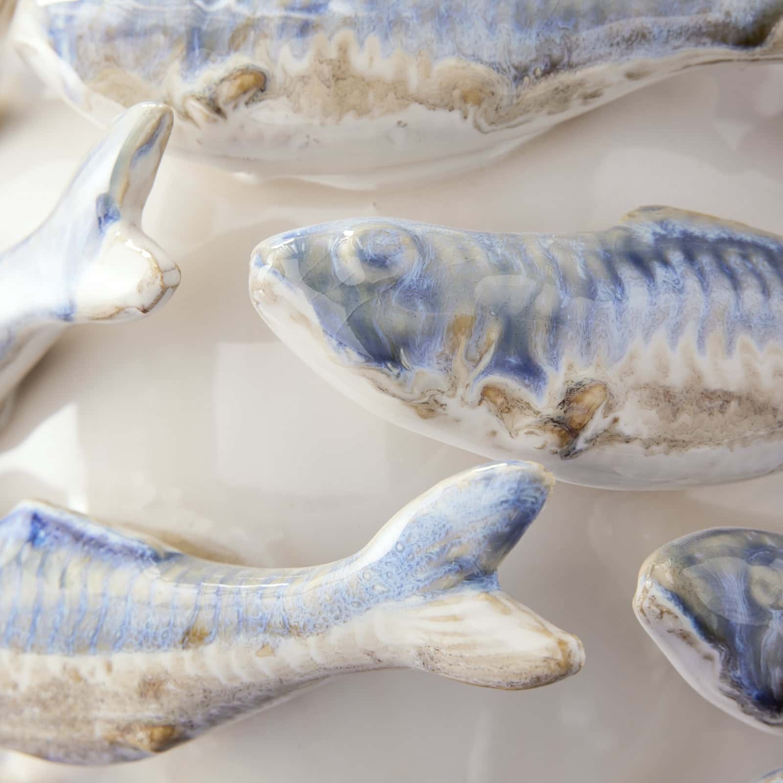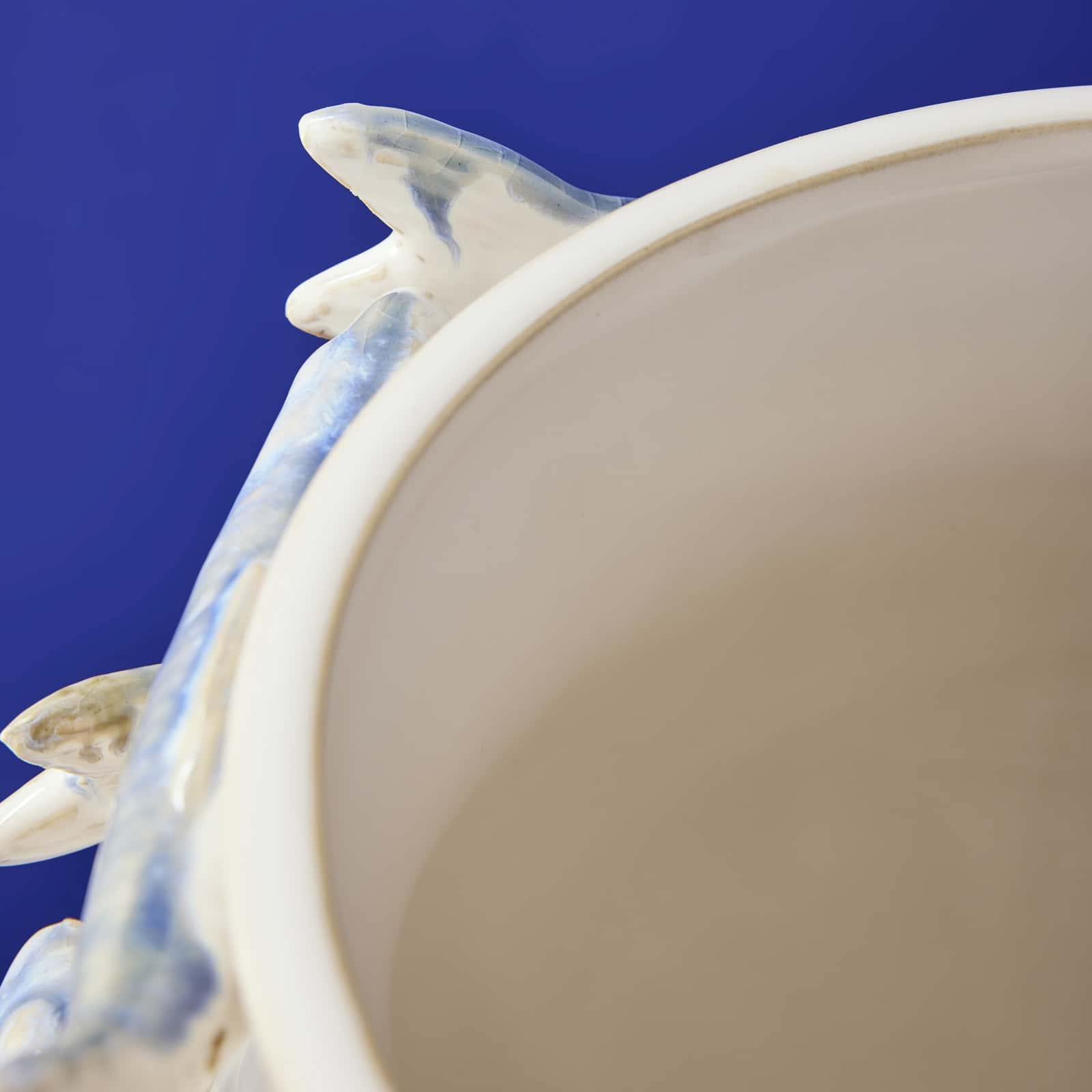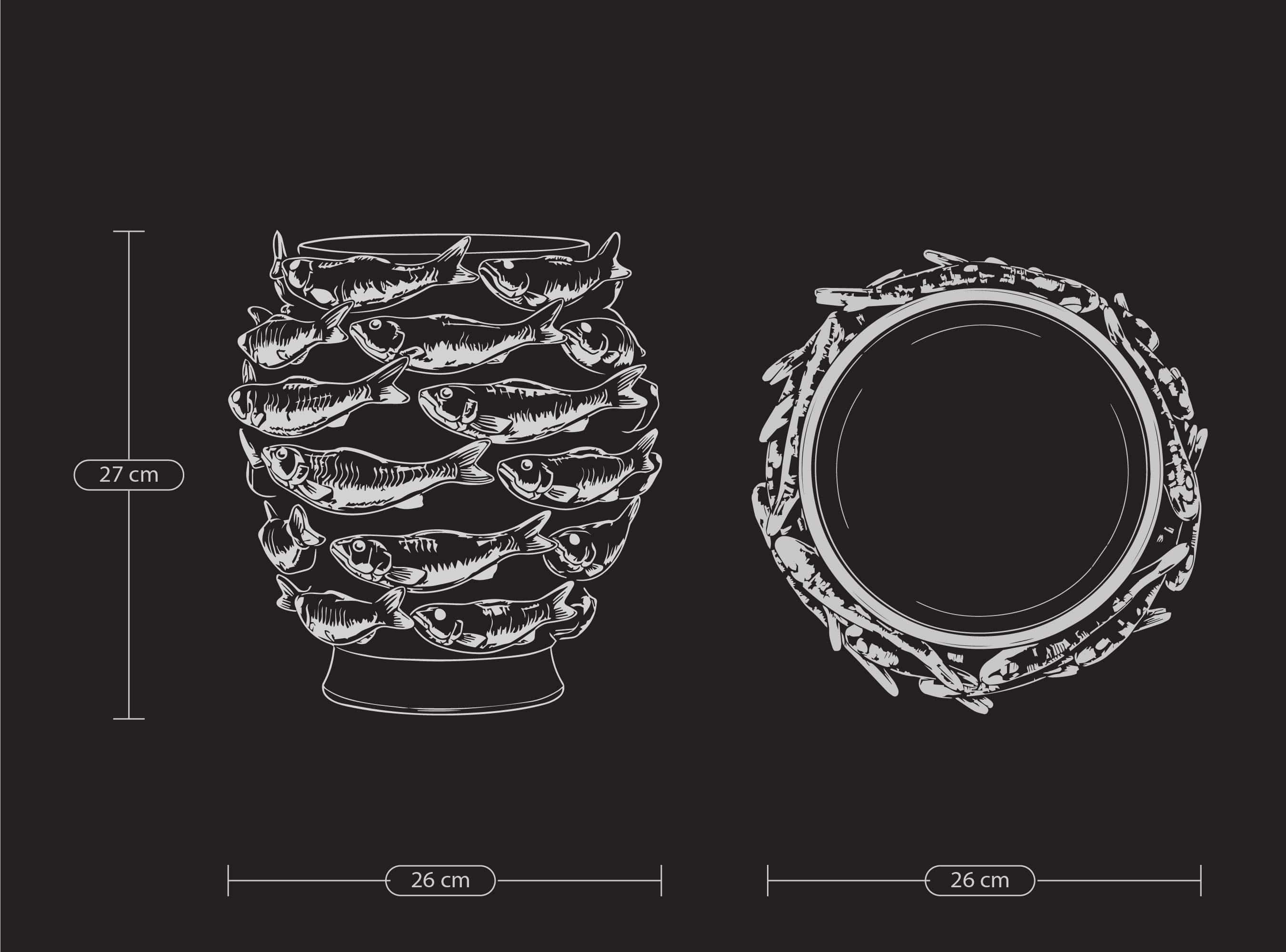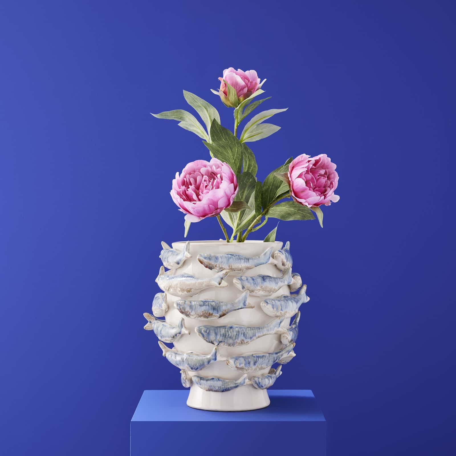 Sculpturale vaas met plastisch uitgewerkte vismotieven en een markante aanwezigheid in de ruimte.